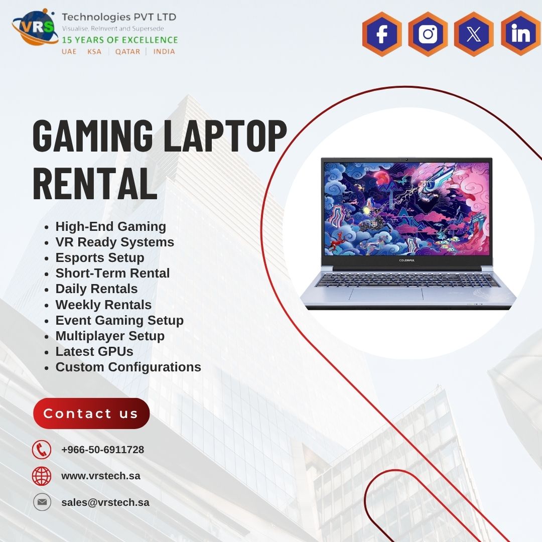 VRS Technologies offers reliable Gaming Laptop Rental with high-performance systems designed for smooth gameplay and demanding applications. Equipped with the latest GPUs and fast processors, our laptops ensure seamless performance for events and projects. Contact +966-50-6911728 today.