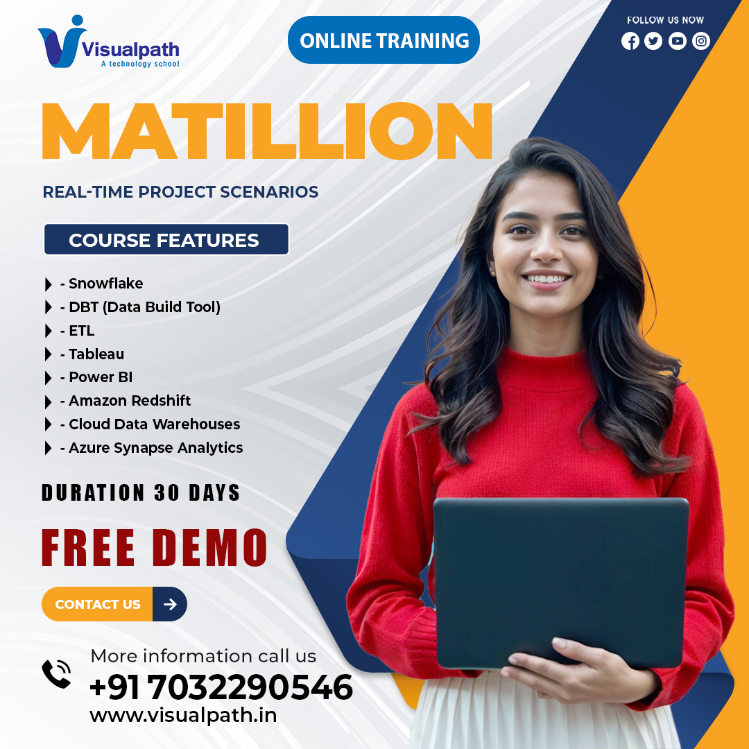 Visualpath:providing Advance your career with Matillion Training in Bangalore. Get Job Oriented Training from our industry Experts. Students gain hands-on experience with our interactive programs. We provide Matillion Training & Career Guidance, with individuals globally in the USA, UK, Canada,Australia. Contact us at +91-7032290546