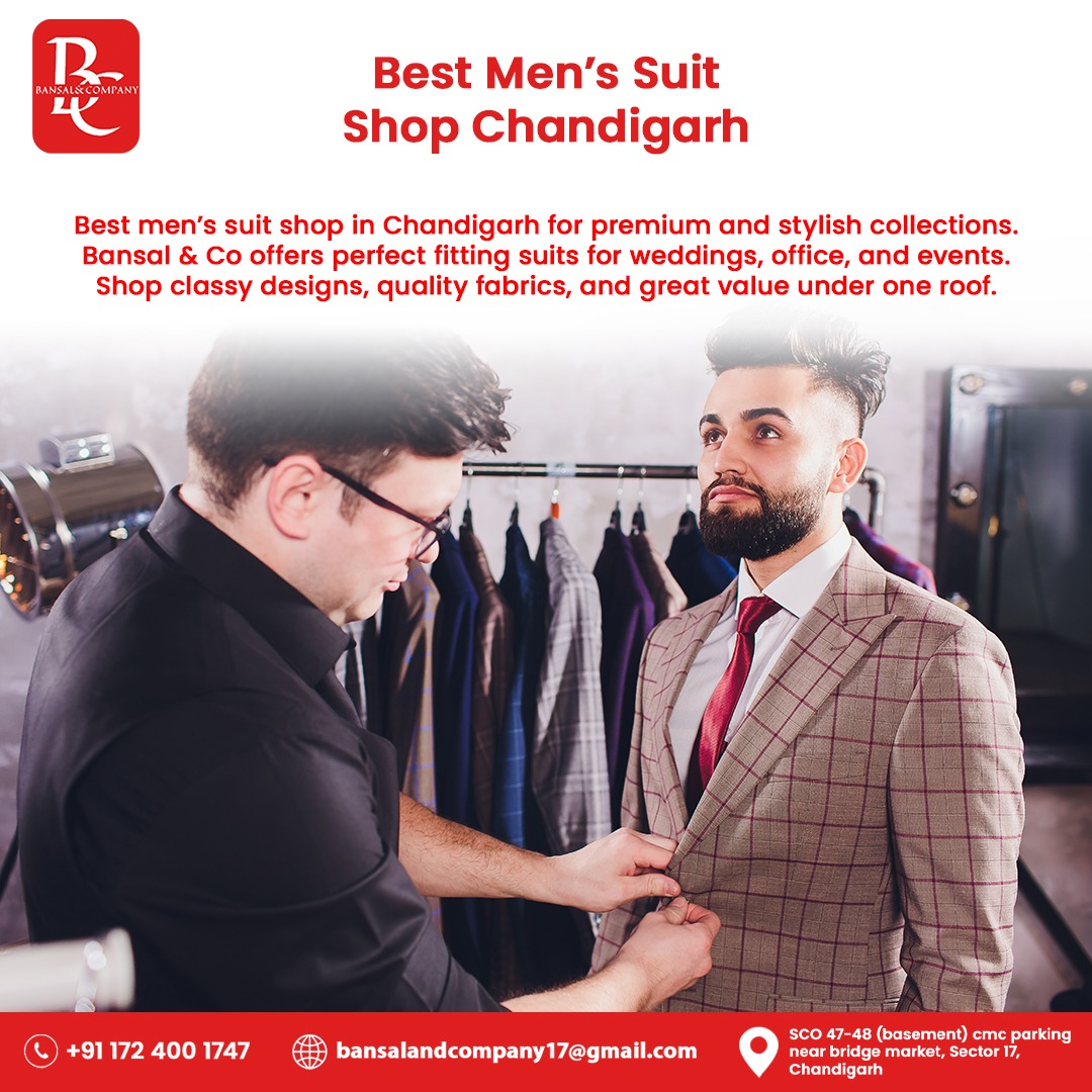 Best men’s suit shop in Chandigarh for premium and stylish collections. Bansal & Co offers perfect fitting suits for weddings, office, and events. Shop classy designs, quality fabrics, and great value under one roof.
