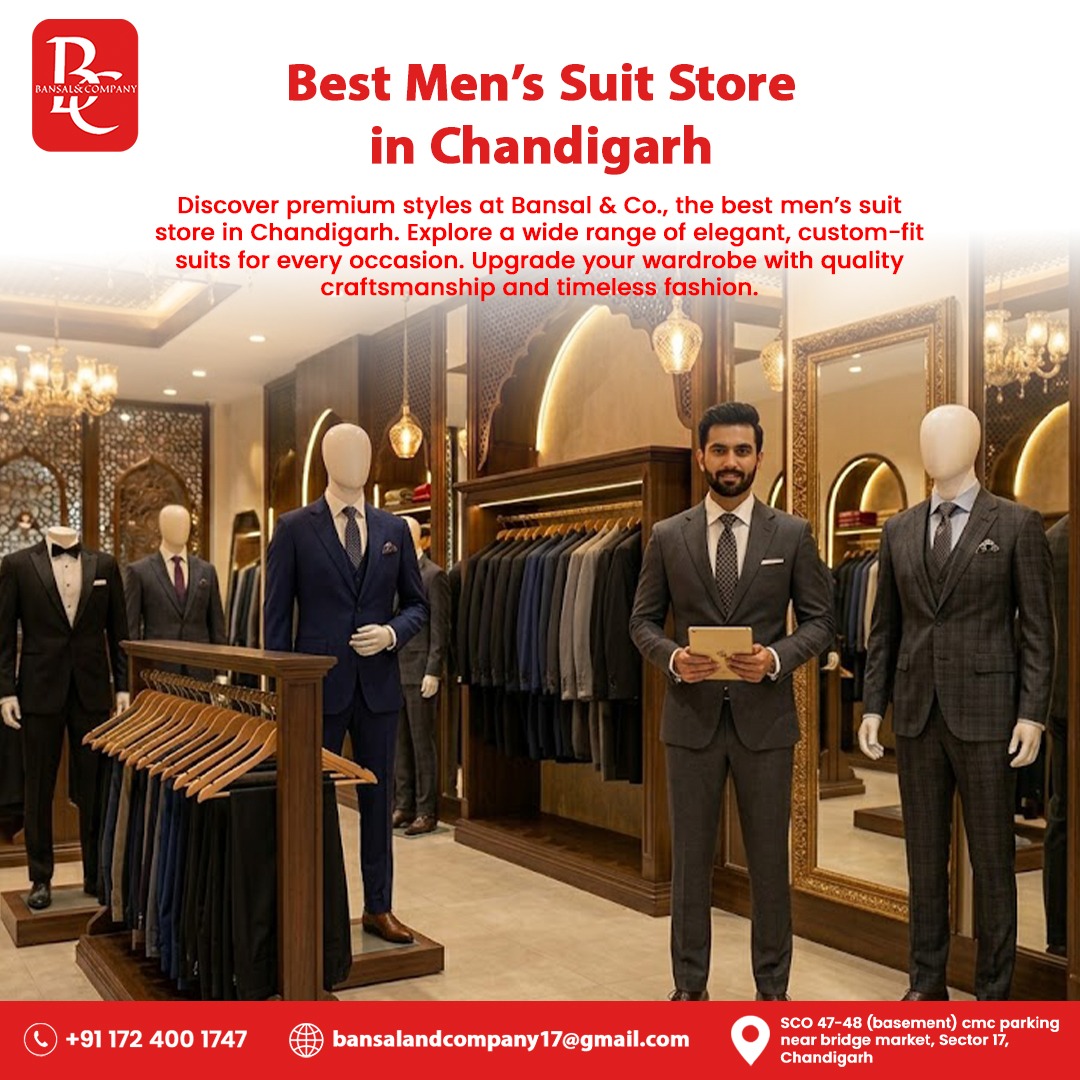 Discover premium styles at Bansal & Co., the best men’s suit store in Chandigarh. Explore a wide range of elegant, custom-fit suits for every occasion. Upgrade your wardrobe with quality craftsmanship and timeless fashion.