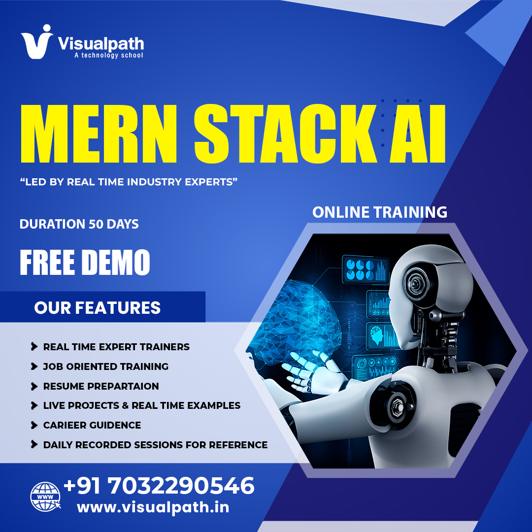 Visualpath leading one of the Best Mern Stack Training in India. We providing real-time Projects and 24/7 Access to Recorded Sessions, highly skilled and certified trainers. Our trainers have 15+ years of experience on Mern Stack AI Training. This course is especially designed for Freshers & Experience. Enroll for a Free Demo Call us: +91-7032290546