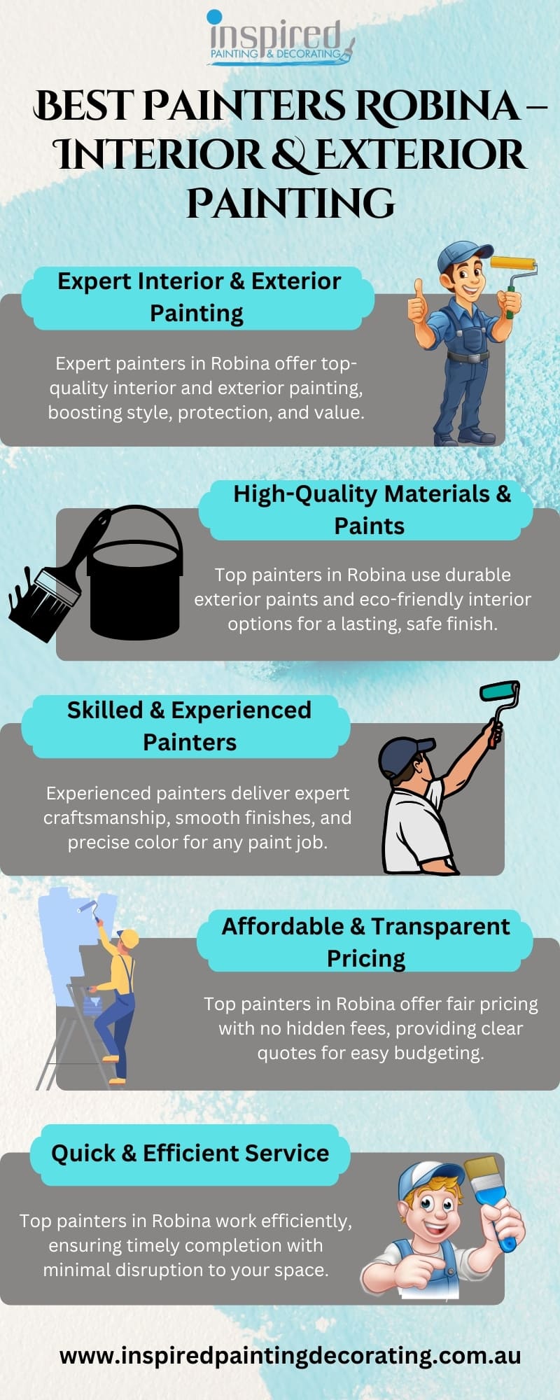 With the help of skilled painters Robina from Inspired Painting & Decorating, you may transform your area. We provide premium exterior and interior painting services that are customised to meet your demands. Our talented staff guarantees exceptional outcomes, whether you're looking to update your house or give your business a polished appearance. Inspired Painting & Decorating is here to assist you if you're looking for trustworthy painters in Robina. To begin, give us a call at +61422081809. Visit Now, https://inspiredpaintingdecorating.com.au/painters-robina/