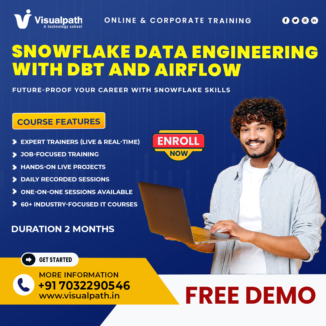 Take your data career to the next level with Visualpath’s Snowflake Data Engineer program. Master Snowflake architecture, DBT, SQL, and automated pipelines through real-time labs. Join Snowflake Data Engineering with DBT Training to gain hands-on experience, expert guidance, and industry-ready skills for top data roles. Call +91-7032290546 to book your free demo.
