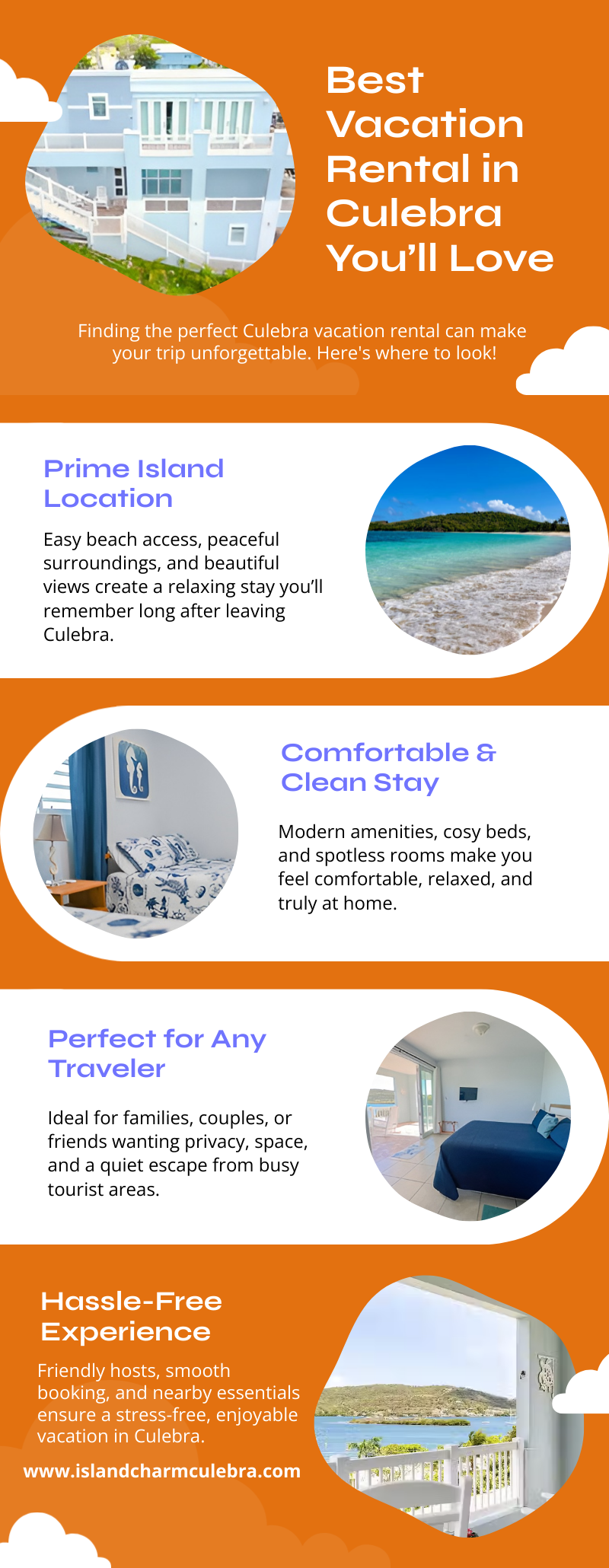 Welcome to Island Charm where you can experience a local, authentic and relaxing vacation with a spectacular water view. Whether you’re chilling on Flamenco Beach, snorkeling with sea turtles, or hiking to a secret spot, we’re here to help you make the most of this beautiful island. Our three level building allows us the opportunity to offer four uniquely different water view accommodations for you and your family to make lasting memories. For more information visit our website - https://www.islandcharmculebra.com/