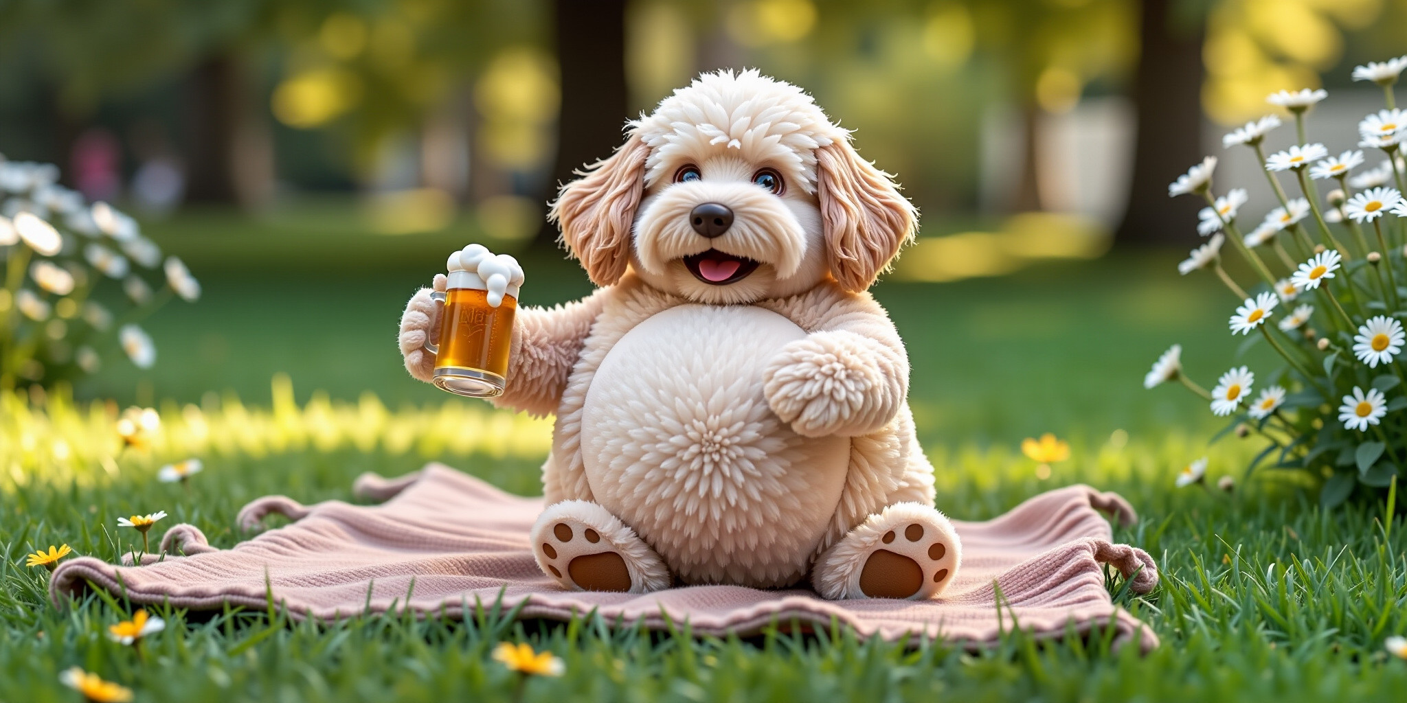Big Belly Bob a plush labradoodle with an absurdly large spherical belly sitting on a cozy rug holdi