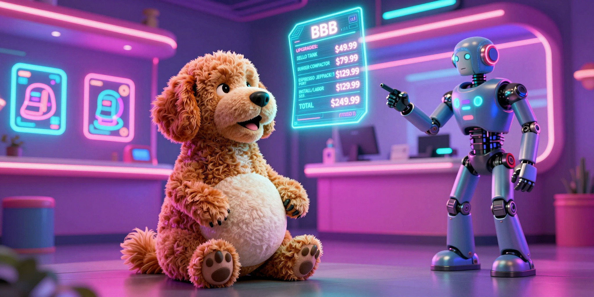 Big Belly Bob BBB a plush labradoodle with an absurdly large spherical belly sitting in a vibrant fu