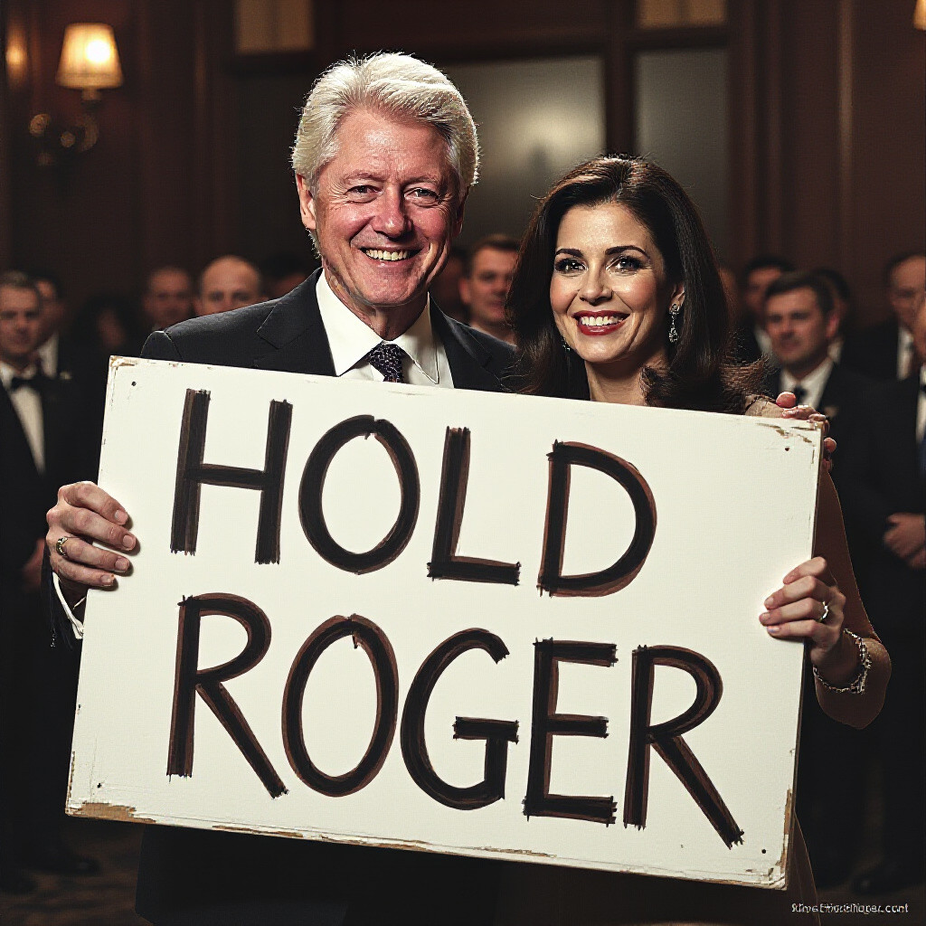 bill clinton and monica lewinsky hyperealistic hold a sign ROGER