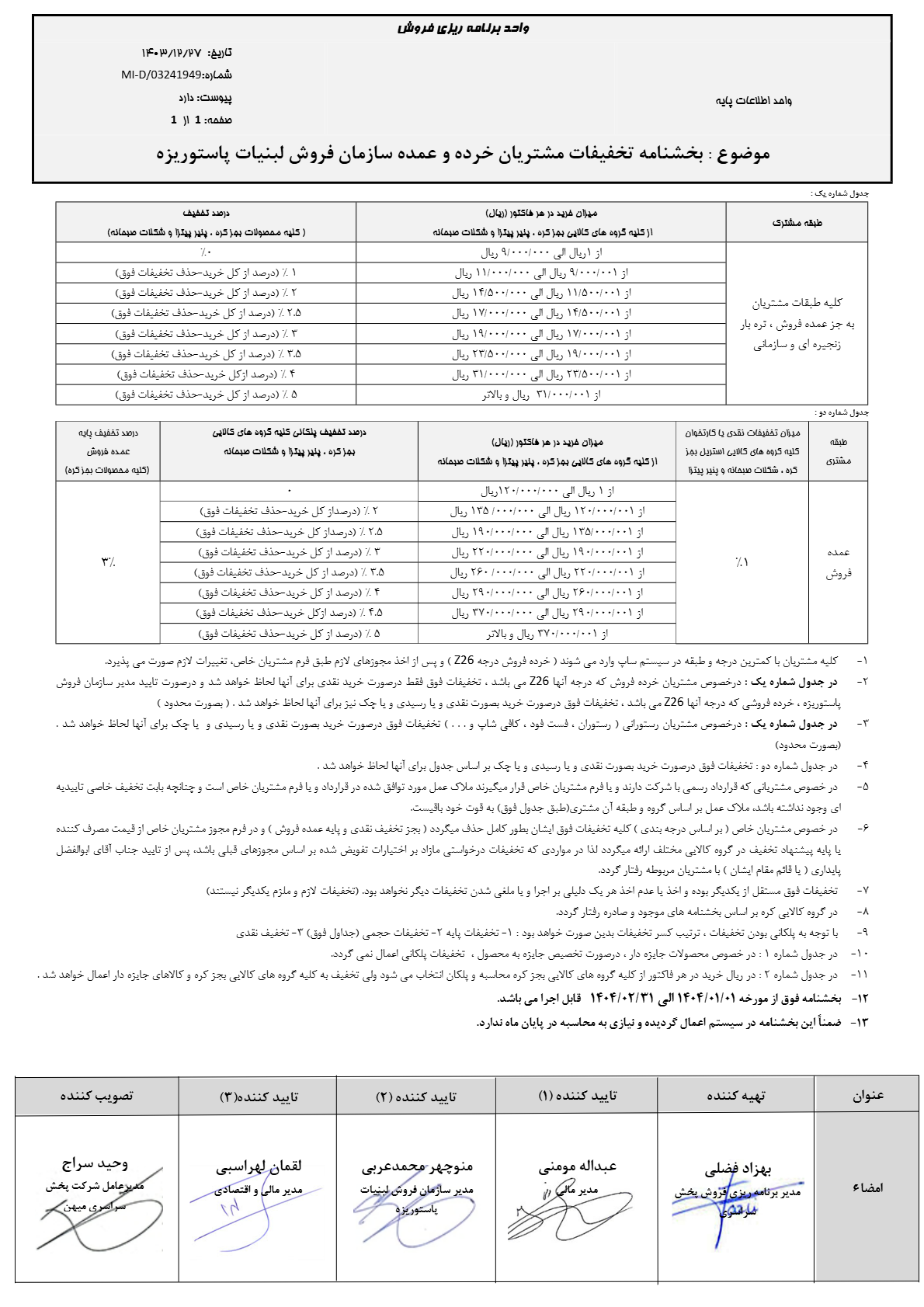 بخشنامه تخفیفات مشتریان خرده و عمده سازمان فروش لبنیات پاستوریزه فروردین و اردیبهشت 1404 1