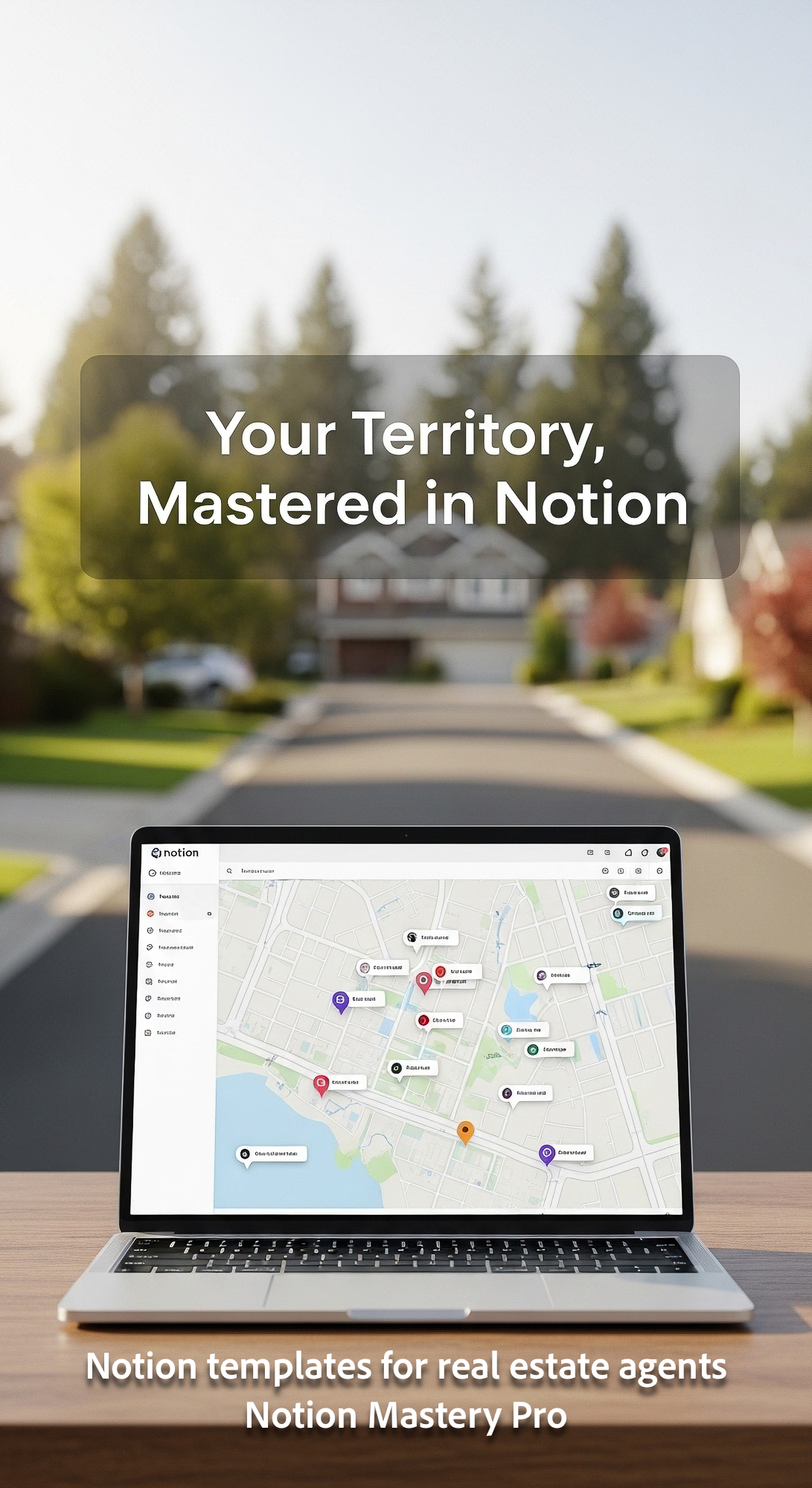 Blurred background of a suburban neighborhood foreground laptop with a Notion lead map Overlay Your