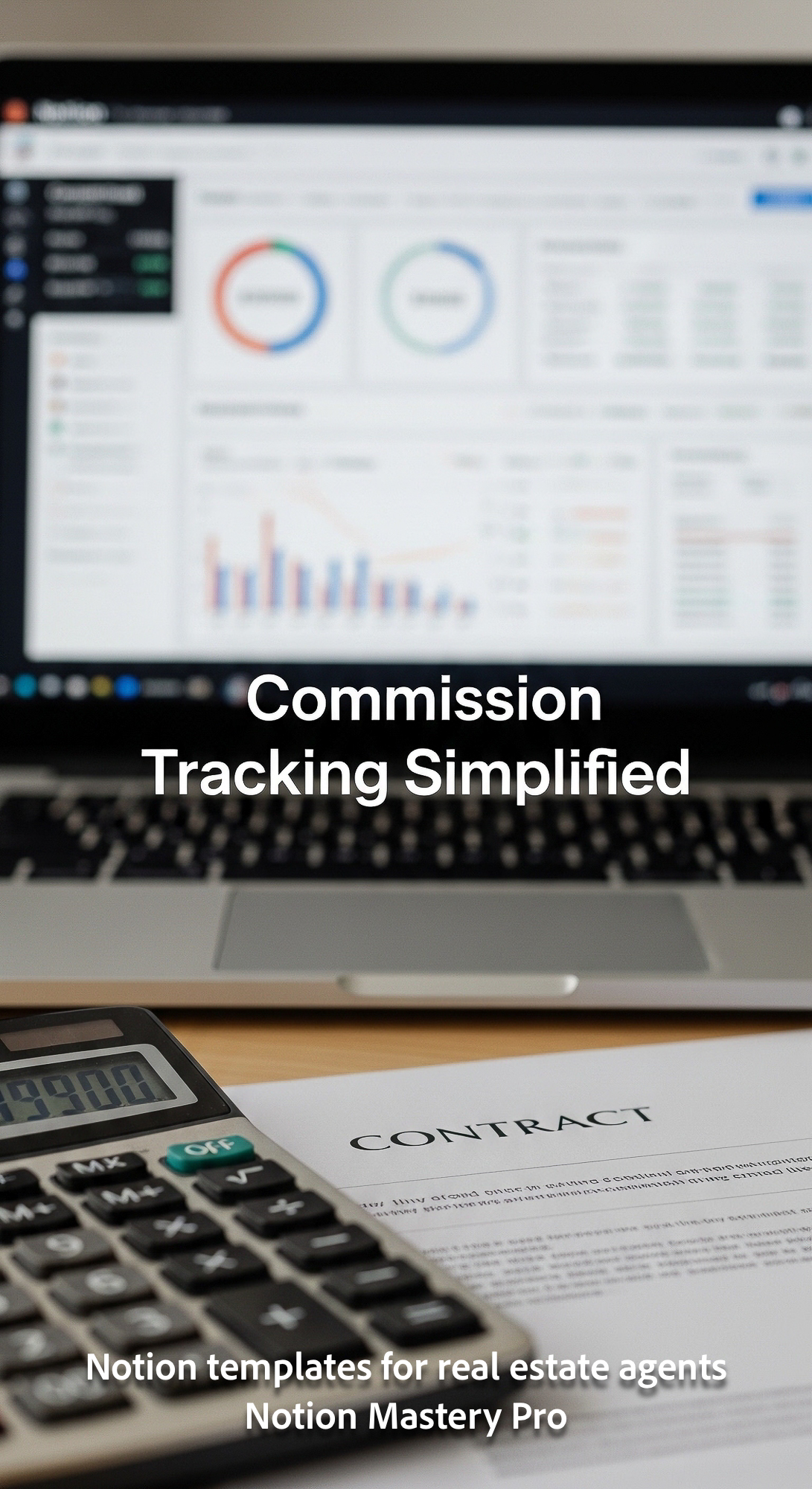 Blurred closeup of a calculator and a contract foreground laptop displaying a comprehensive Notion f