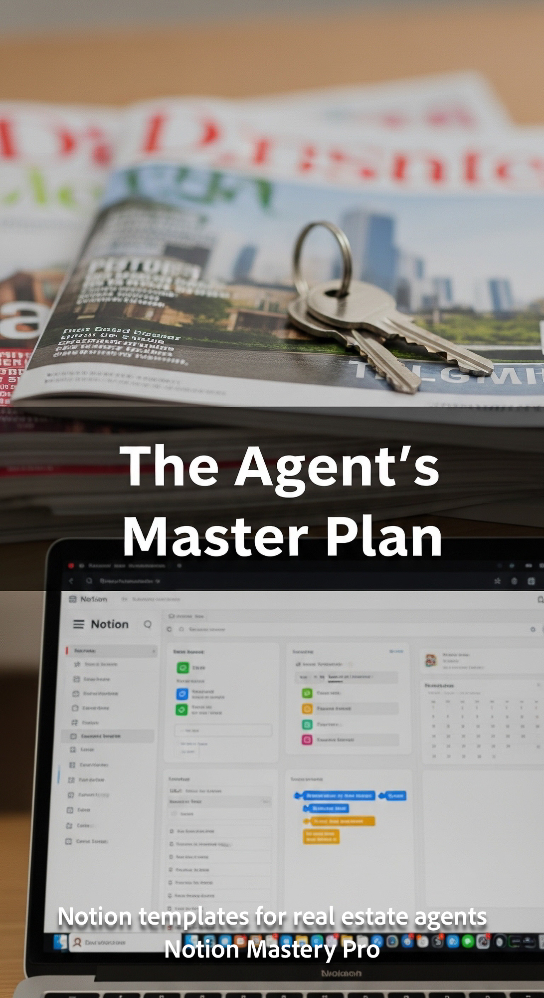 Blurred closeup of a stack of real estate magazines and keys foreground laptop running Notion Overla