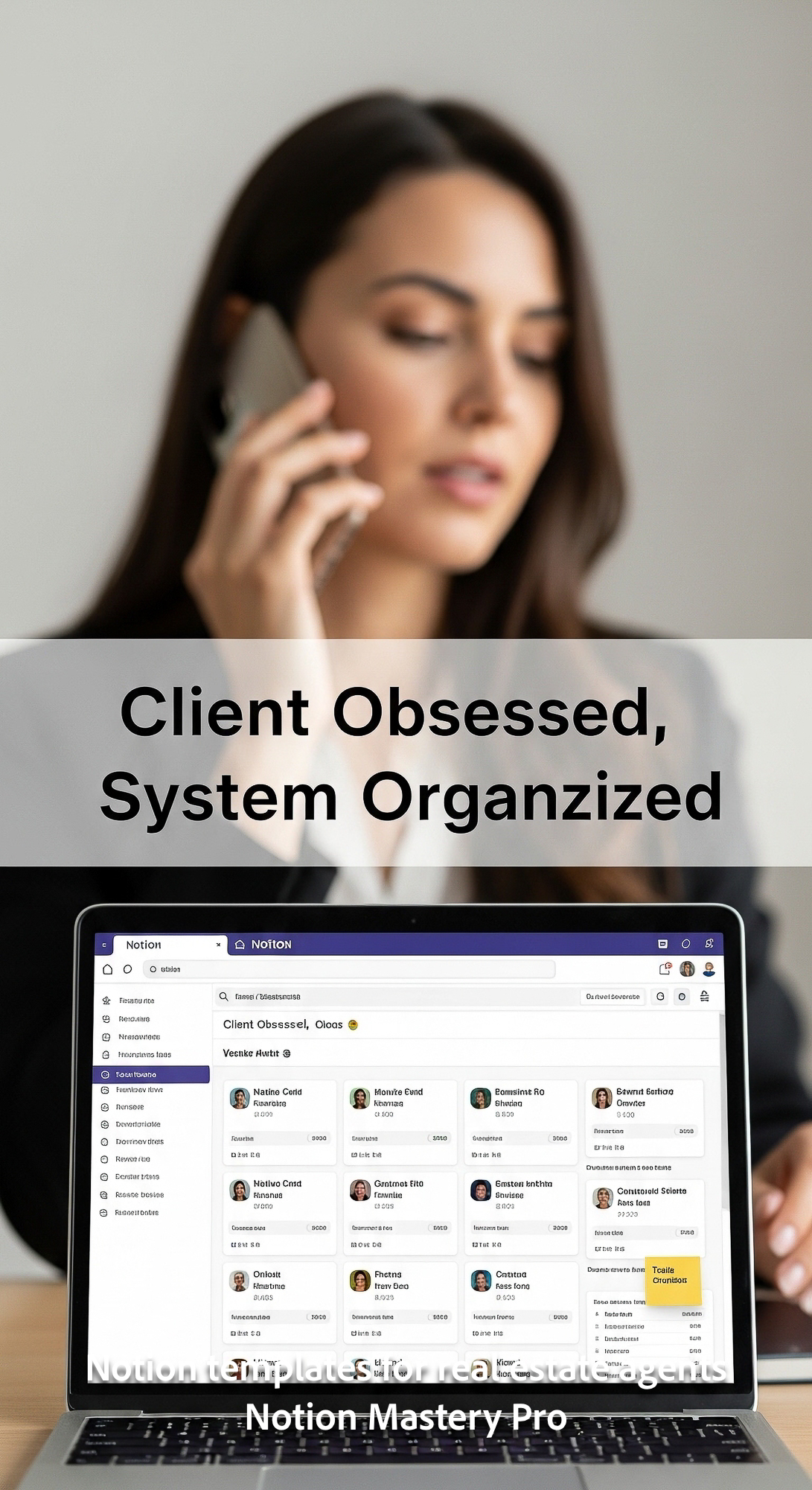 Blurred image of a realtor talking on the phone foreground laptop with a Notion CRM Overlay Client O