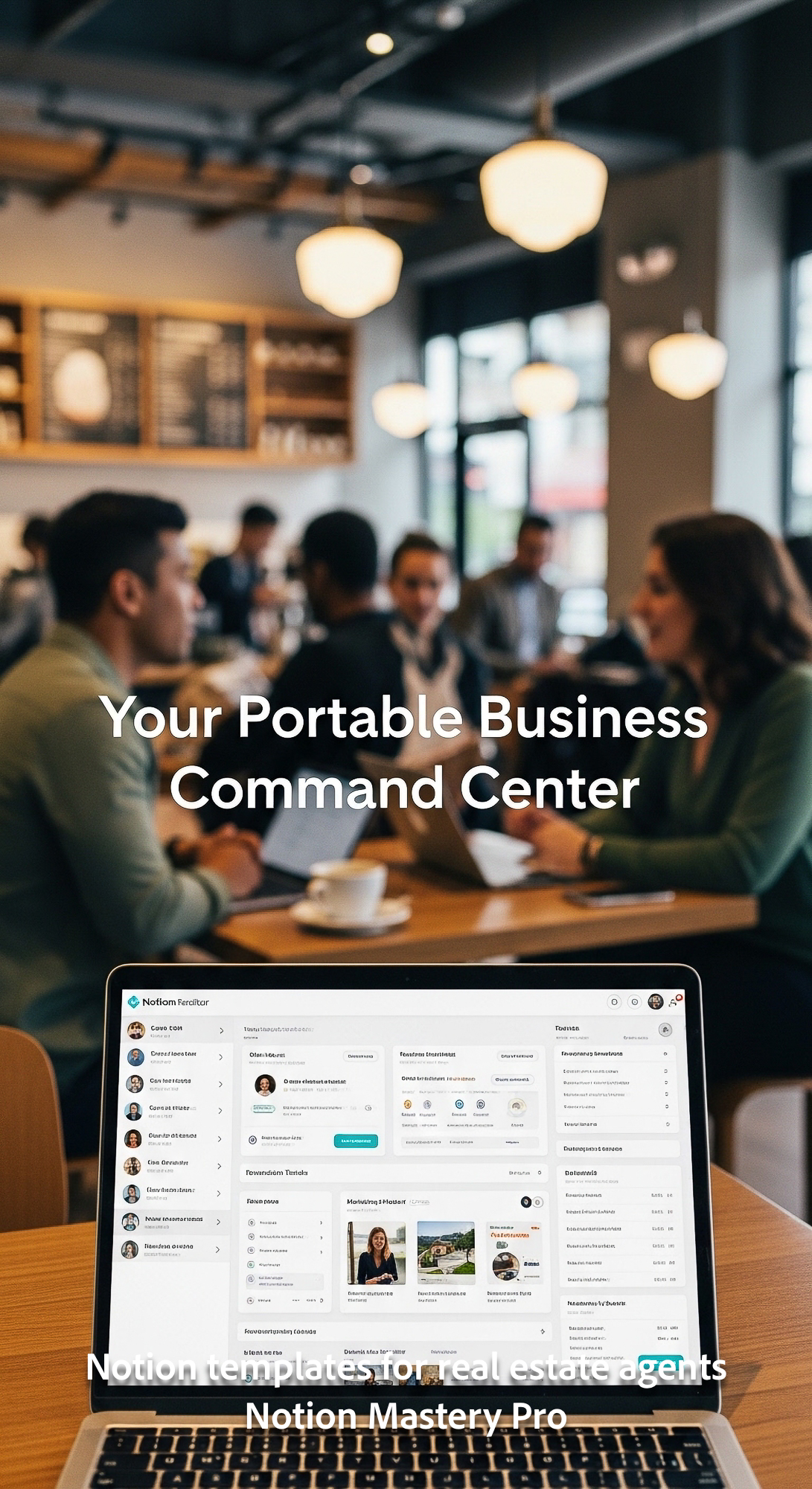 Blurred interior of a modern coffee shop with diverse professionals foreground laptop displaying a c