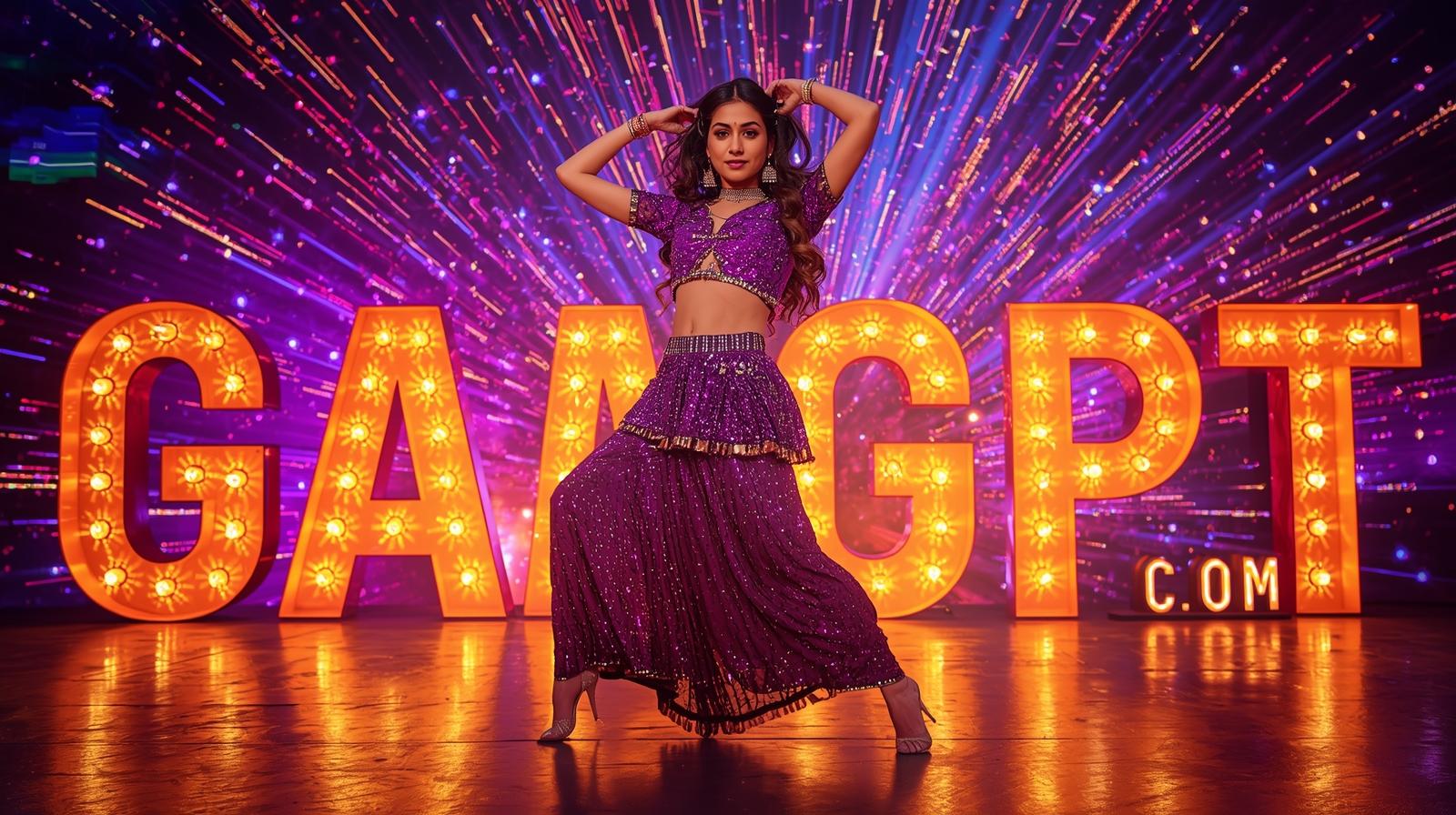 Bollywood item song dancer with shimmering purple sequins, explosive background lights; “GaanaGPT.co
