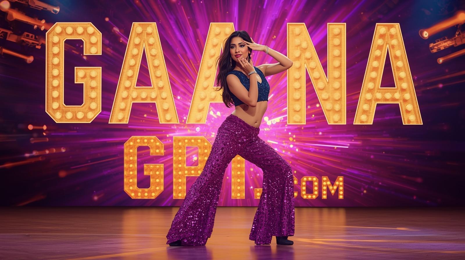 Bollywood item song dancer with shimmering purple sequins, explosive background lights; “GaanaGPT.co