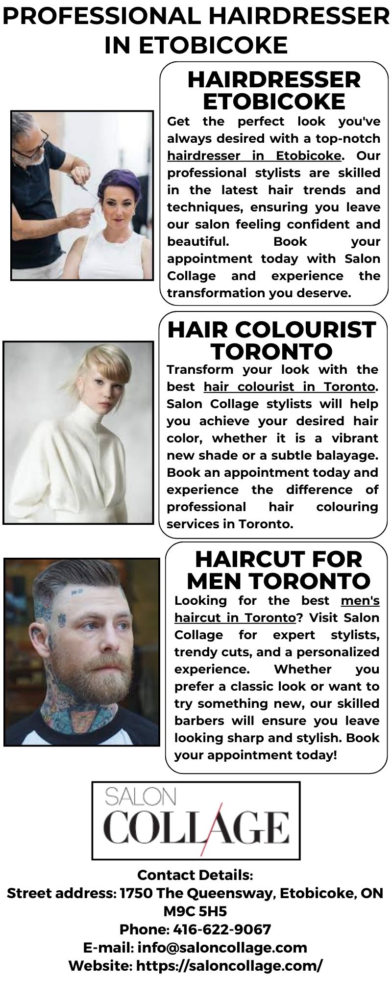 At Salon Collage in Etobicoke, we are dedicated to transforming your hair into a masterpiece. Our skilled hairdressers combine passion and expertise to craft personalized styles that reflect your unique personality. Book your appointment now and let Salon Collage’s hairdresser in Etobicoke redefine your style.