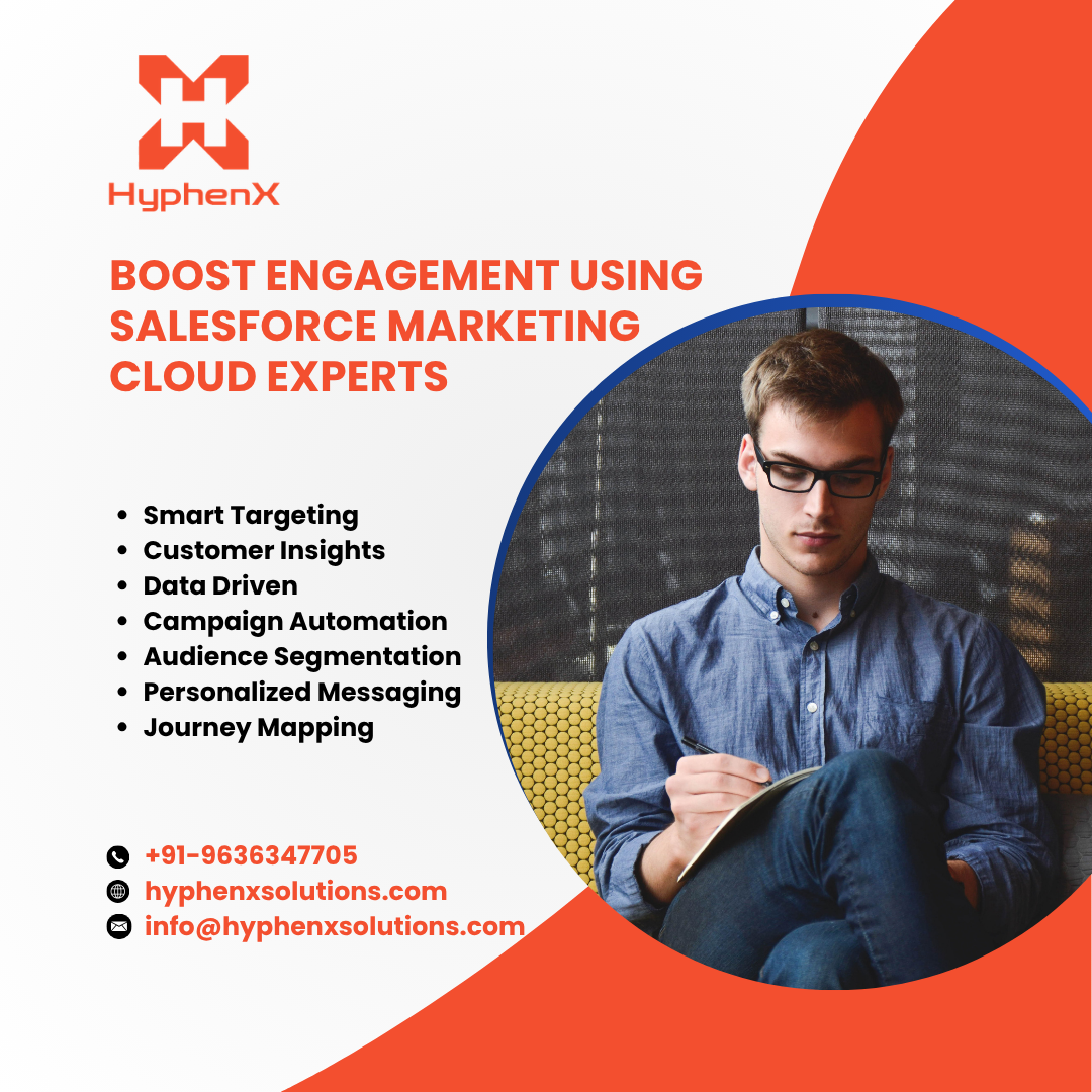 HyphenX offers skilled Salesforce Marketing Cloud Experts who help businesses create personalized and data driven marketing strategies. With deep expertise in automation, customer journey mapping, and audience segmentation, HyphenX ensures every campaign delivers measurable results. The team focuses on understanding customer behavior and crafting targeted messages that improve engagement and conversions. From email marketing to multi channel campaigns, every solution is tailored to business goals. By choosing Salesforce Marketing Cloud Experts at HyphenX, companies can streamline marketing efforts, enhance customer experiences, and achieve consistent growth in a competitive digital landscape.