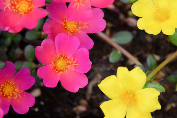 Bright and vibrant hot pink and yellow portulaca blooms