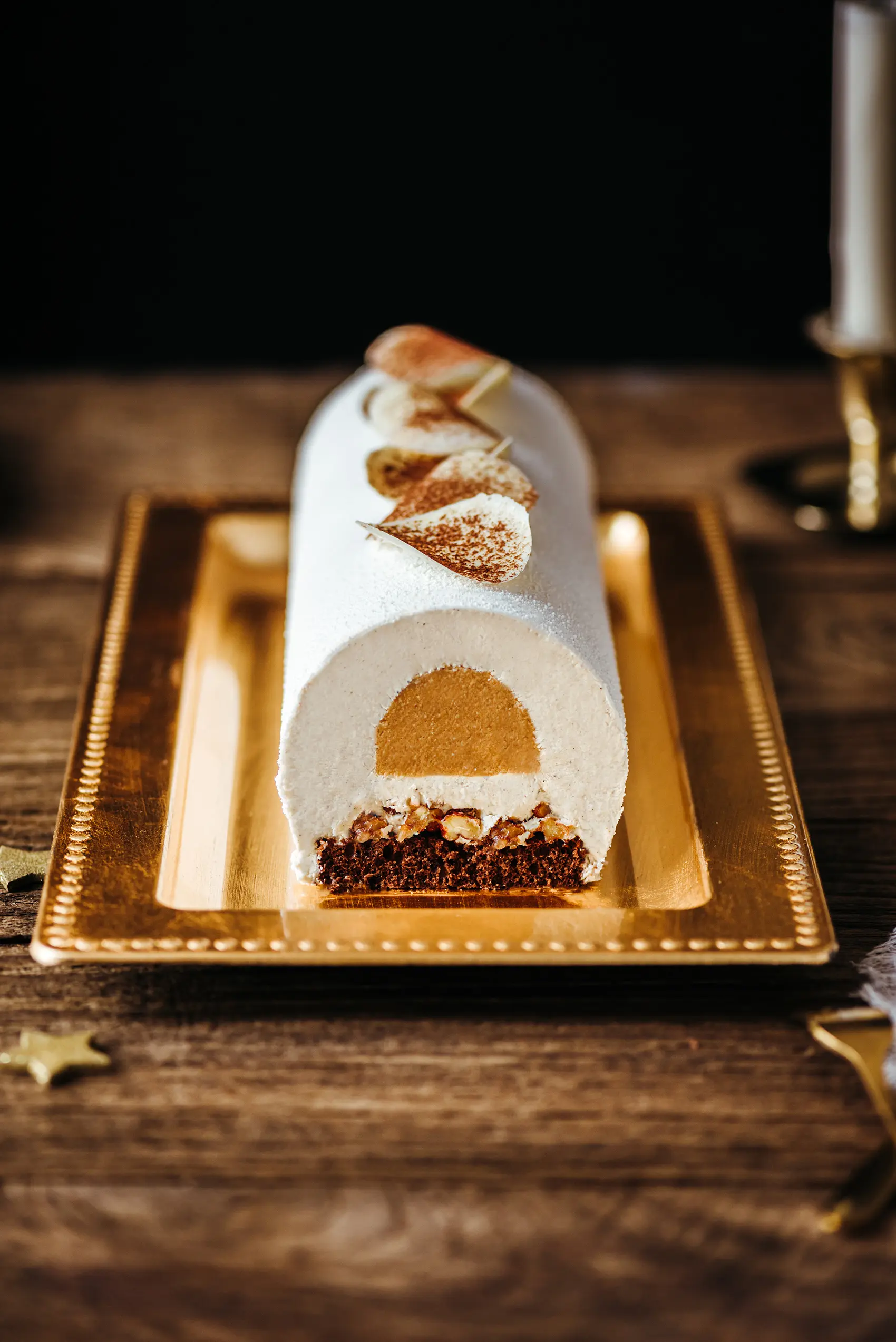 Buche noel mousse vanille chocolat blanc caramel zoom Lilie Bakery