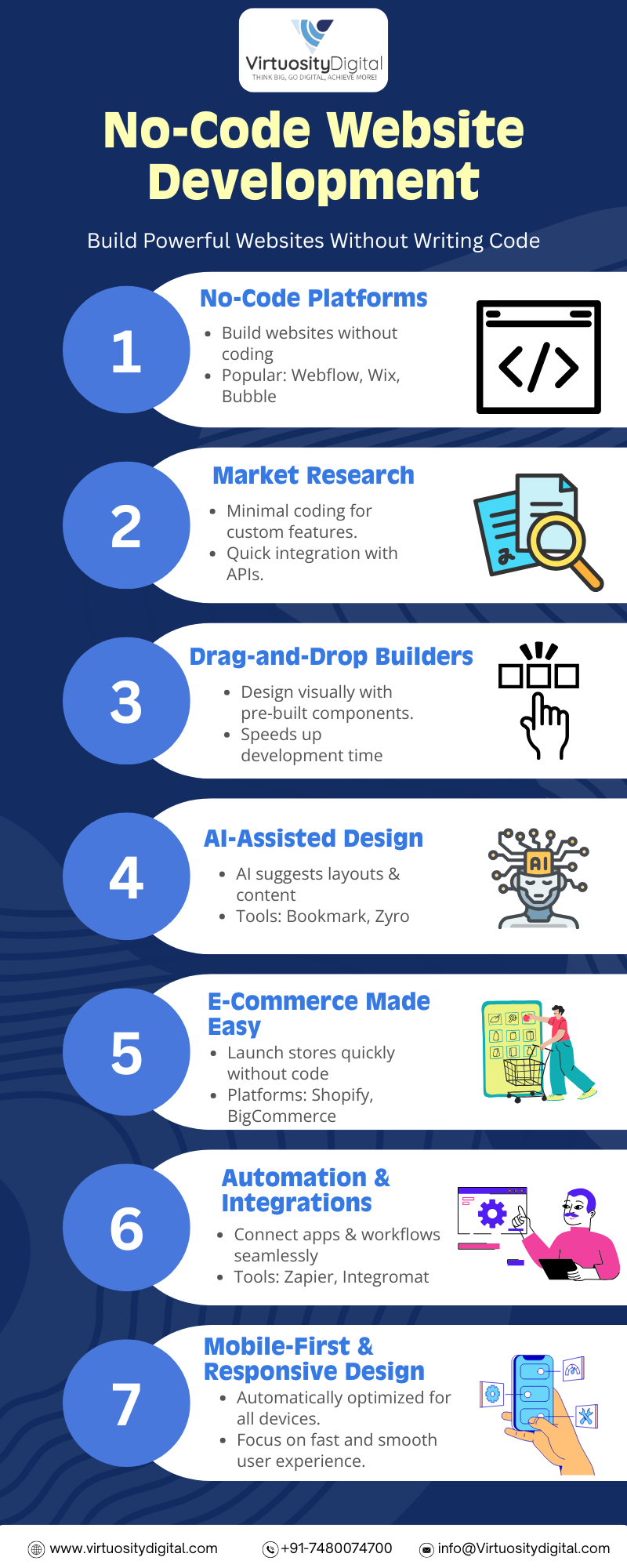 This infographic highlights how no-code website development helps startups, marketers and creators build powerful websites without technical skills. It explains the role of drag-and-drop builders, AI-assisted design, market research, automation, integrations and easy e-commerce features. It also shows how mobile-first and responsive design improves speed, usability and performance across devices. A perfect guide for anyone who wants faster and smarter website creation. Start building your website today with no-code tools and launch your ideas faster.