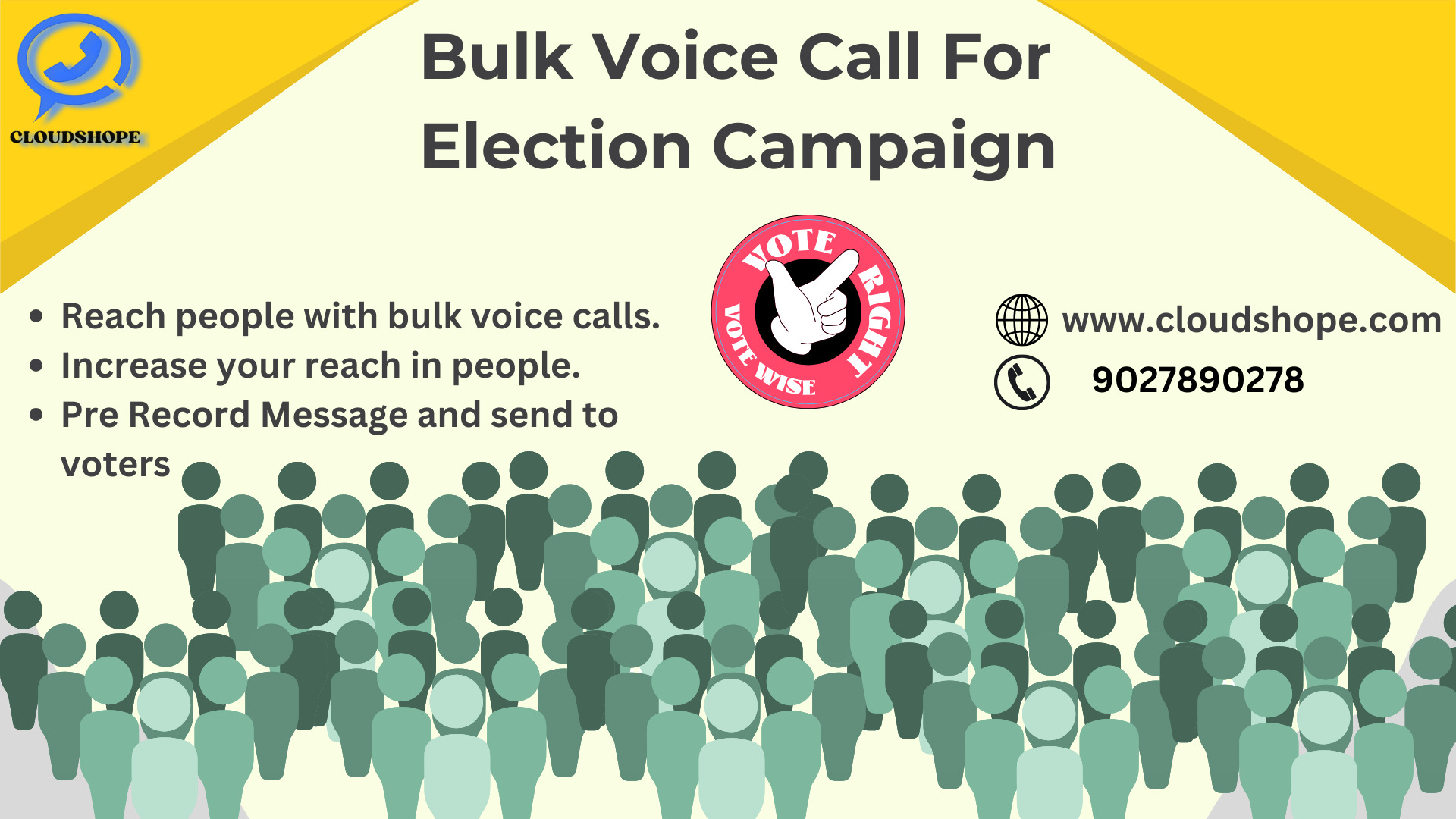 Bulk Voice Call and Bulk SMS services are vital for political parties during election campaigns. These services provide a completely automated online system to connect with a large audience by delivering pre-recorded voice messages and text messages to mobile numbers across India. They help in grabbing the attention of the target audience, increasing the party's presence, conveying messages to prospective voters, and reaching a large number of people cost-effectively. CloudShope Technologies offers Bulk Voice Calls for Election Campaign. Bulk Voice calls are used for Election Campaign that allows you to reach out to more than thousands of people at once. After a couple of years, the Bulk Voice Call for Political Parties has dominated the promotion and advertising domain. For more details you can directly contact us at 9649643643 or 9027890278.
