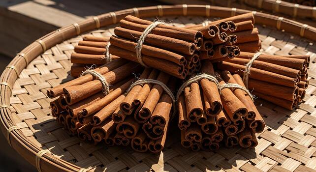 bundles of cinnamon sticks on woven tray brown spices natural ingredients free photo