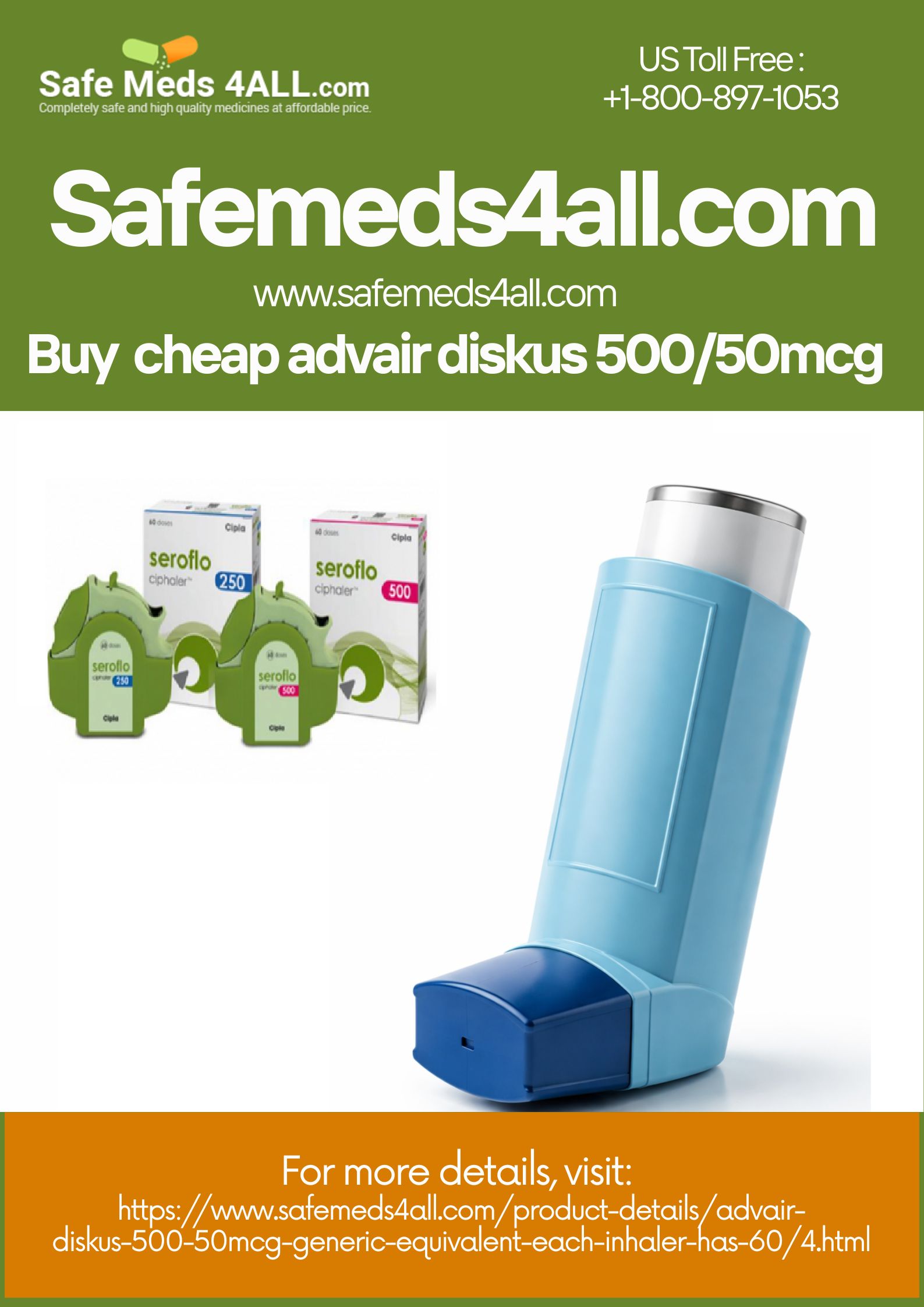 Advair Diskus inhaler is used to prevent asthma attacks and to treat chronic obstructive pulmonary disease (COPD). Buy cheap Advair Diskus 500/50mcg inhaler online from Safemeds4all at low prices with free worldwide shipping. Order now! For more details, visit: https://www.safemeds4all.com/product-details/advair-diskus-500-50mcg-generic-equivalent-each-inhaler-has-60/4.html