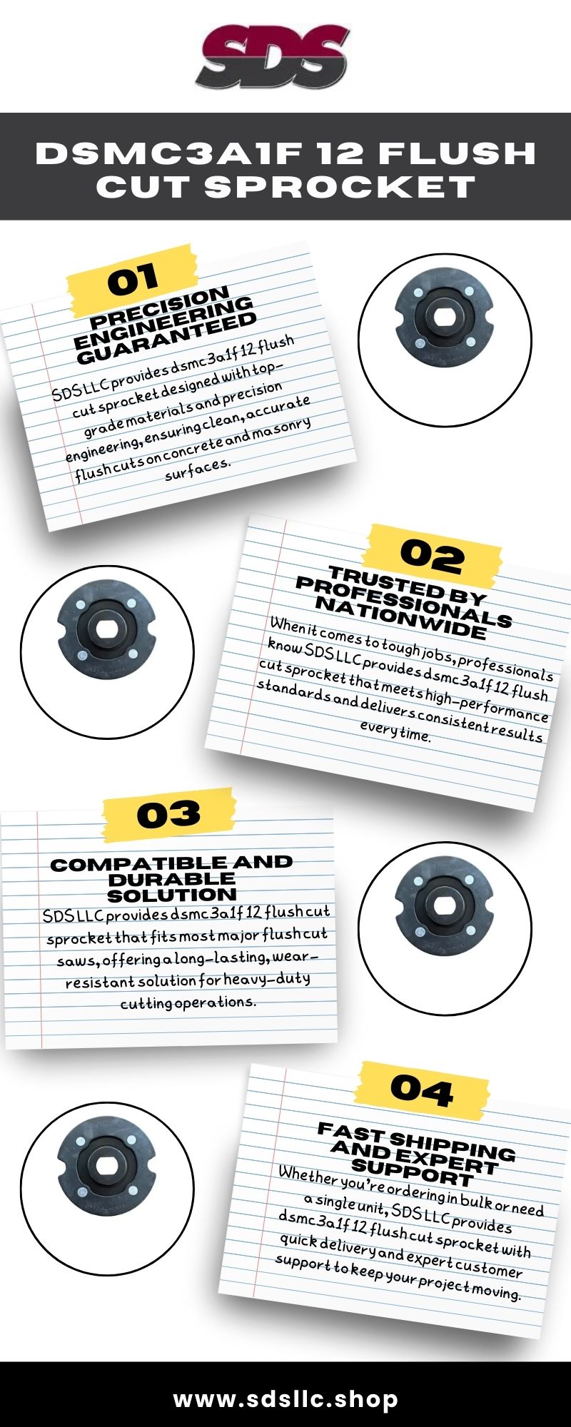 SDS LLC provides dsmc3a1f 12 flush cut sprocket designed for precision and durability in concrete cutting applications. Engineered for top performance, this sprocket ensures smooth, efficient cuts with reduced wear. Ideal for professional contractors, SDS LLC delivers reliable tools to enhance your cutting projects. Trust SDS LLC for premium DSMC3A1F 12 flush cut sprockets and unmatched performance.