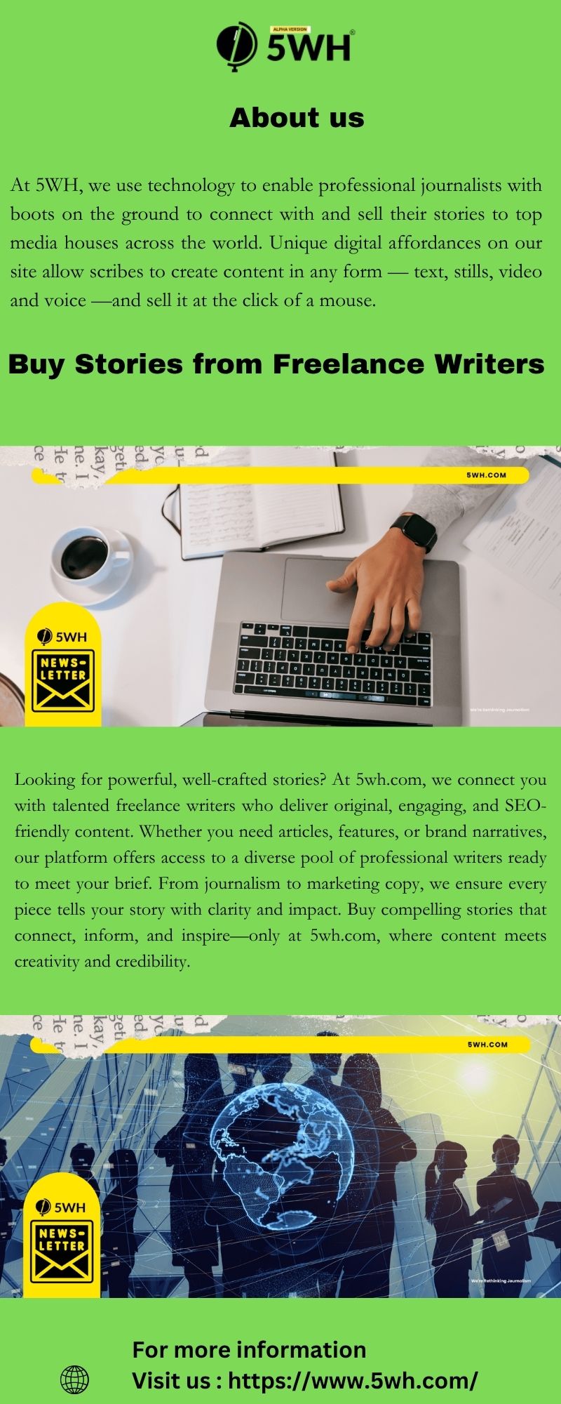 Discover compelling narratives and original reporting with 5wh.com. We connect you with talented freelance journalists who craft authentic, fact-driven stories tailored to your needs—whether for blogs, news sites, magazines, or brand content. Each piece is thoroughly researched and ready for publishing. With 5wh.com, you’re not just buying content—you’re investing in storytelling that informs, engages, and inspires. Find the right voice for your audience and elevate your platform today. Buy stories from skilled writers, only at 5wh.com.