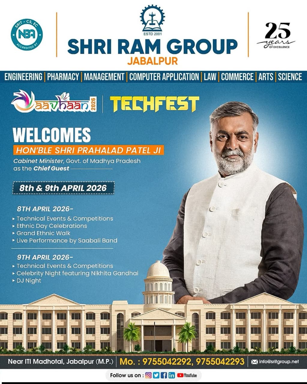 We the Shri Ram Group feel honored to welcome the Cabinet Minister Shri Prahlad Patel ji as our Chief Guest on Day 1 of Aavhaan Tech Fest 2026. Under his keynote speech, our students of the best private engineering college in Jabalpur had an inspiring start to innovation and achieve excellence.