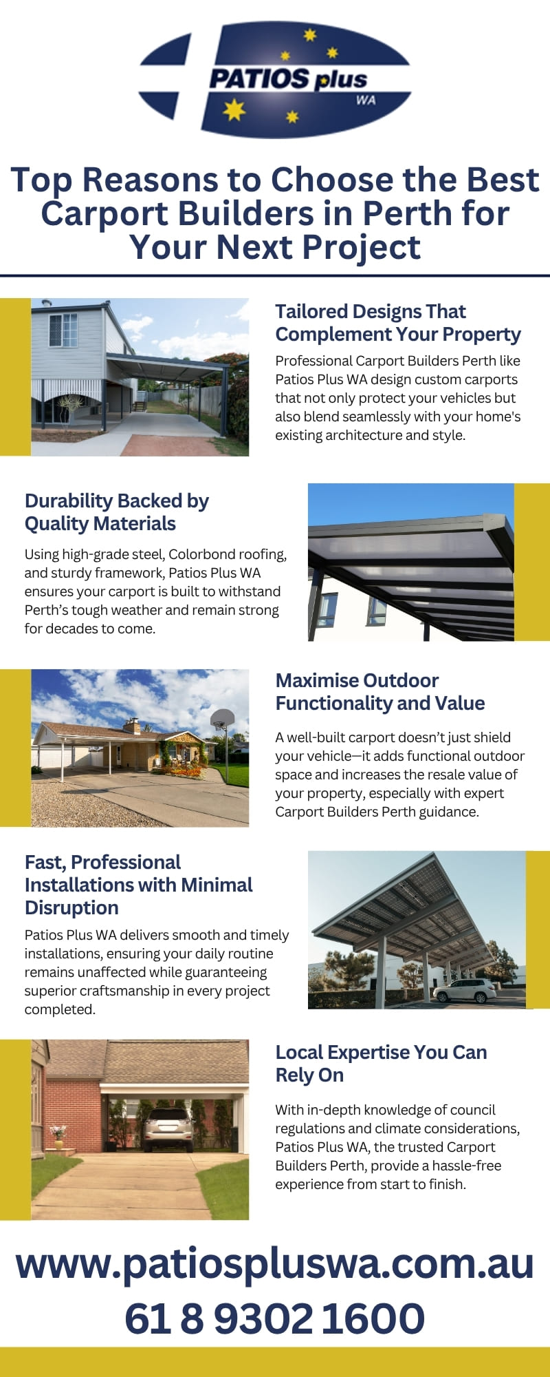 Patios Plus WA's skilled Carport Builders Perth can help you improve your outside area. Our speciality is creating unique patterns that are both stylish and long-lasting, making them ideal for safeguarding your cars. For dependable and durable solutions, rely on our knowledgeable Carport Builders in Perth. Call 61 8 9302 1600 to speak with Patios Plus WA about your needs for carport installation. Visit Now, https://patiospluswa.com.au/carport-builders-perth/