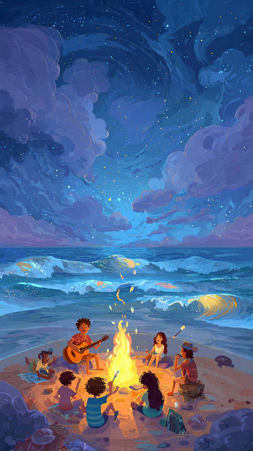 cartoon friends around beach bonfire guitars marsh