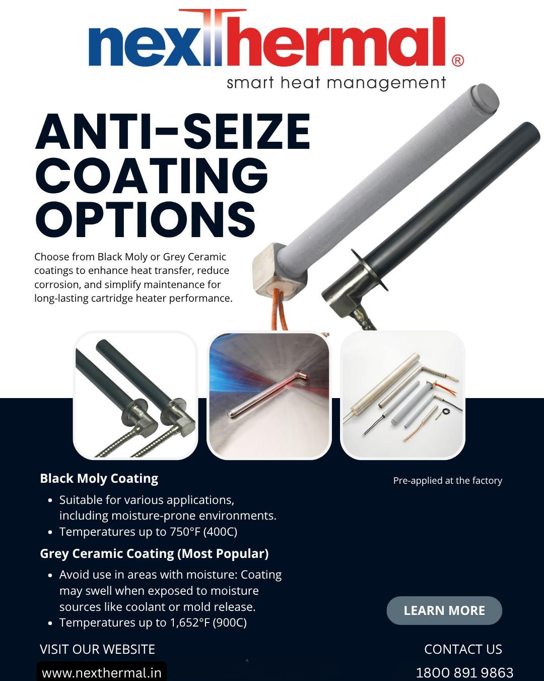 Every detail matters when it comes to performance and reliability. Nexthermal’s anti-seize coating options—Black Moly and Grey Ceramic—are engineered to enhance heat transfer, reduce corrosion, and simplify maintenance for long-lasting cartridge heater performance. Visit for more details: https://www.nexthermal.in/ Visit our service page: https://www.nexthermal.in/cartridge-heater/ Phone Number: 1800 891 9863 #Nexthermal #SmartHeatManagement #CartridgeHeaters #ThermalSolutions #EngineeringInnovation #HeatTransfer #ElectricHeatingElements #customelectricheatingelements #CeramicInfraredHeatermanufacturer #cartridgeheatingelementsmanufacturer #coilheatermanufacturer #temperaturesensormanufacturersindia #Thermalengineeringservicesproviderindia