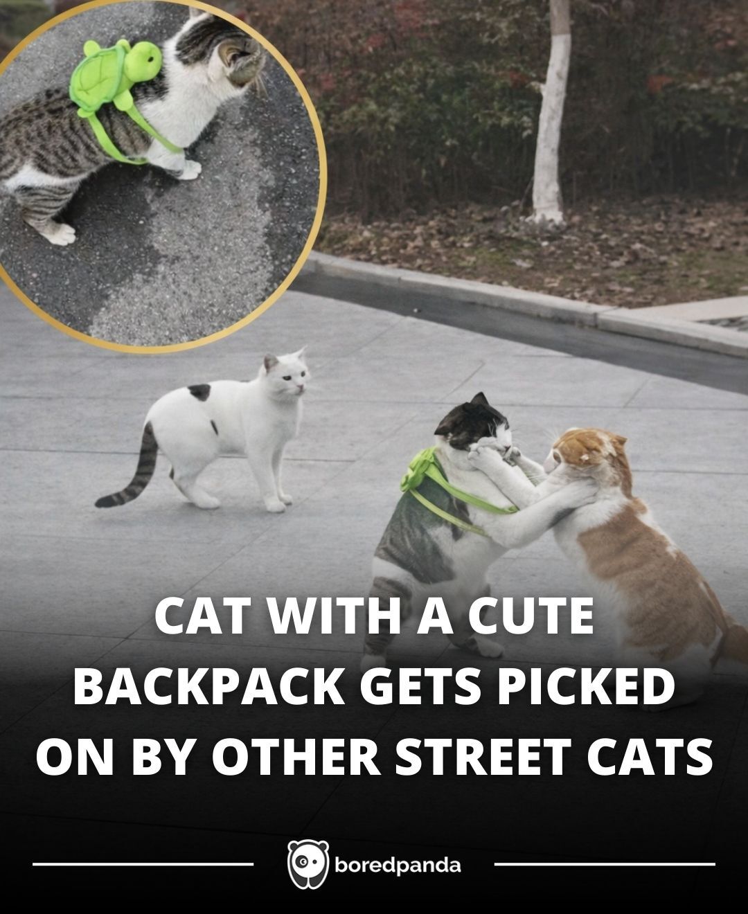 CAT WITH A CUTE BACKPACK GETS PICKED ON BY OTHER STREET CATS