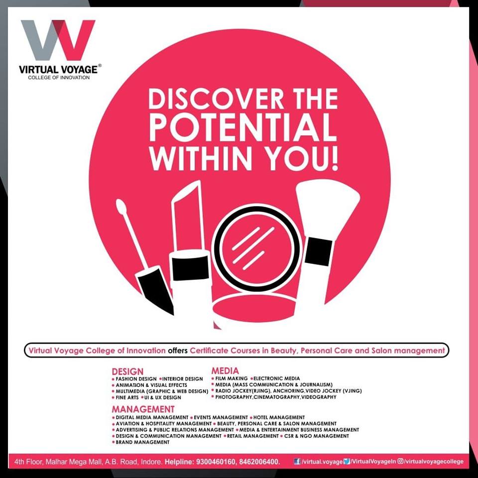 Virtual Voyage College of Innovation gives you a chance to DISCOVER THE POTENTIAL WITHIN YOU by offering a Certificate Course in Beauty, Personal Care and Salon Management. Call Now!!!