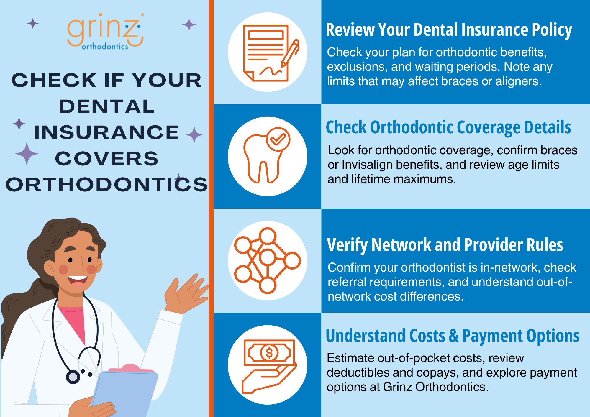 Before starting braces or Invisalign, it’s important to understand your dental insurance. This infographic explains how to review your policy, confirm orthodontic benefits, network rules, and out-of-pocket costs. Learn how to check if your dental insurance covers orthodontics so you can avoid surprises and plan treatment with confidence. It also outlines payment options at Grinz Orthodontics to help make care more affordable. Read the full blog now at https://grinzorthodontics.com/what-dental-insurance-covers-orthodontics/
