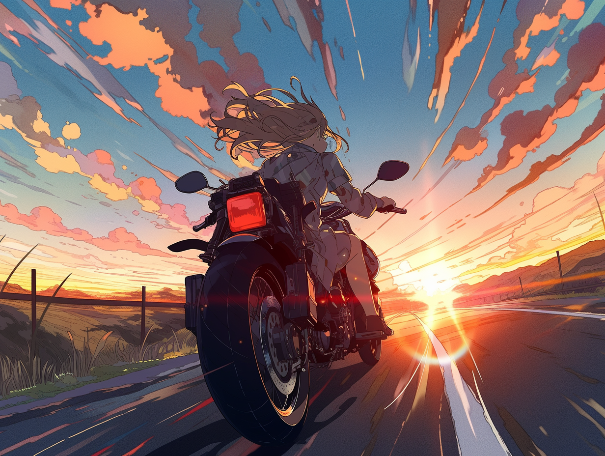 chowmeins speeding down on a road in a motorcycle with a sunset 9e4145db e1fe 42ea a2d9 4812b03414ae