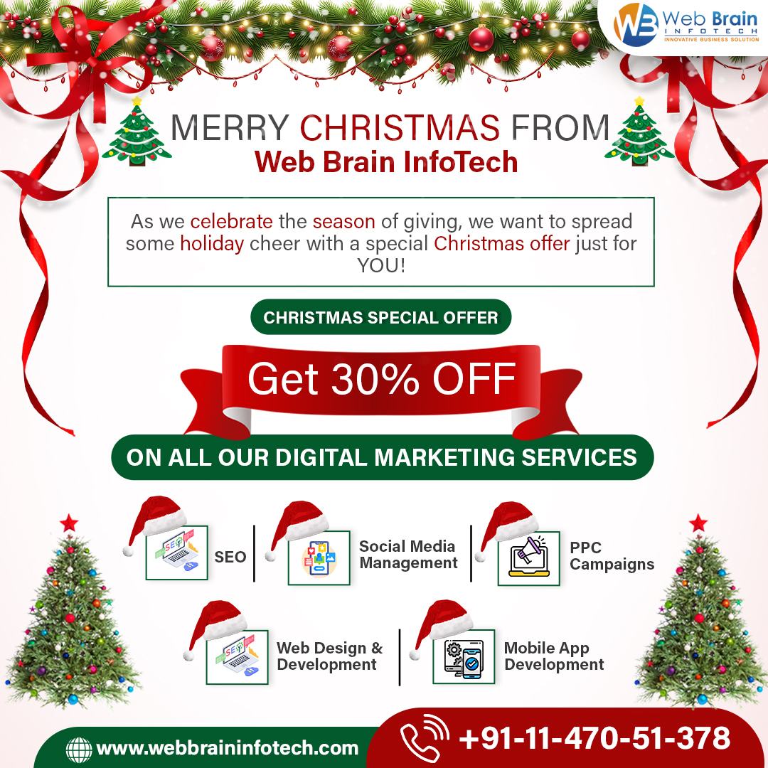 This festive season, take your business to the next level with Web Brain InfoTech! Get 30% OFF on all our Digital Marketing Services: SEO for better rankings Social Media Marketing for engagement PPC to drive results Content Marketing to tell your story Don’t miss this chance to grow your brand during the holidays! Contact us now or visit www.webbraininfotech.com to claim this festive offer.