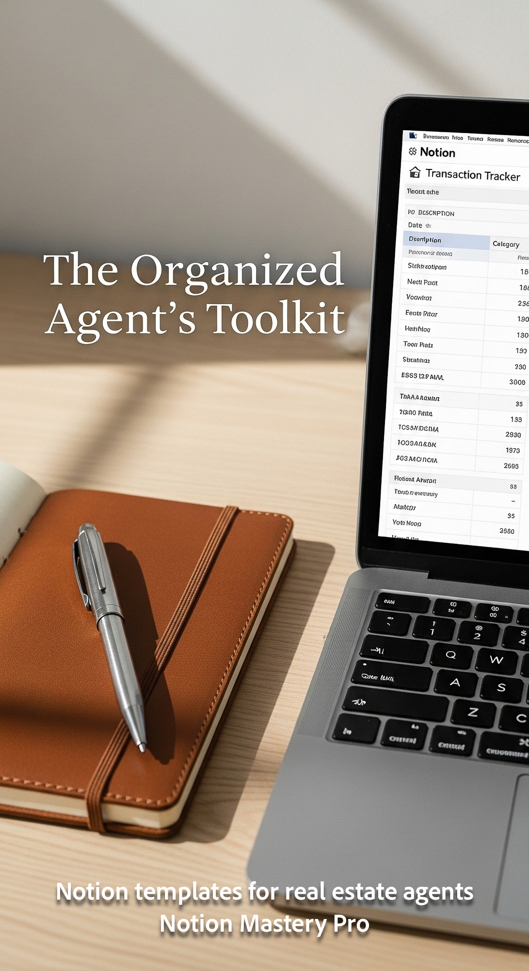 Close up of a designer pen and a leather notepad next to a MacBook with a clean gridlike Notion tran