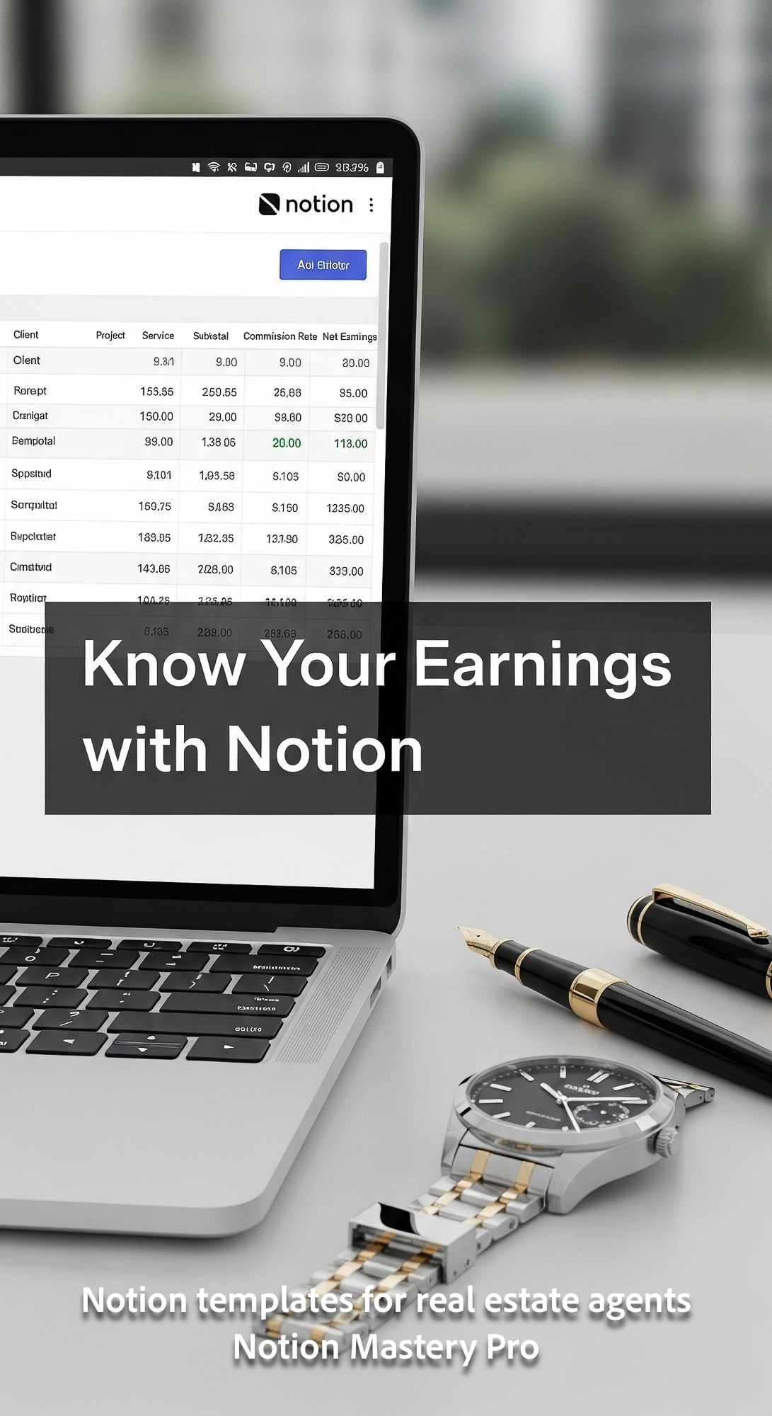 Close up of a designer watch and a fountain pen next to an open laptop displaying a detailed Notion