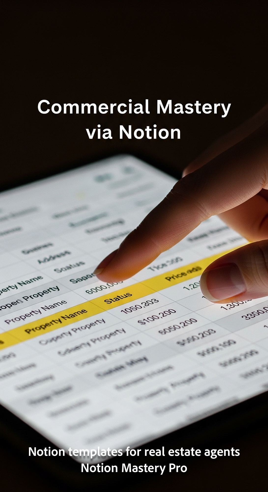Close up of a hand scrolling through a Notion database of commercial properties Overlay Commercial M