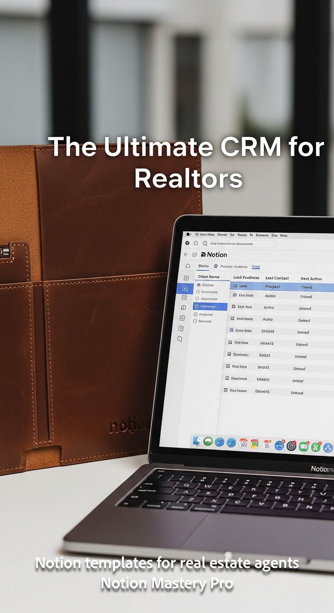 Close up of a highquality leather portfolio next to an open MacBook Pro displaying a comprehensive N