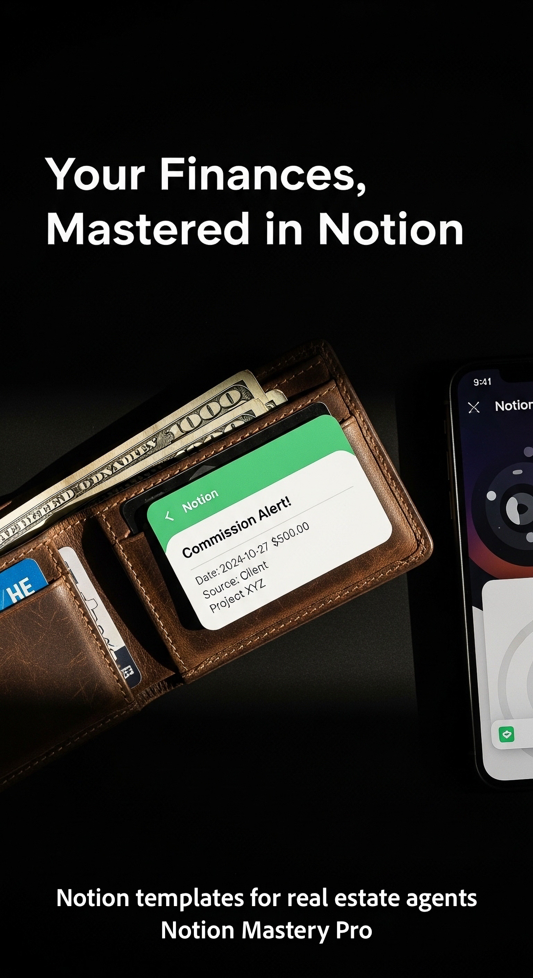 Close up of a leather wallet and a smartphone with a Notion commission alert Overlay Your Finances M