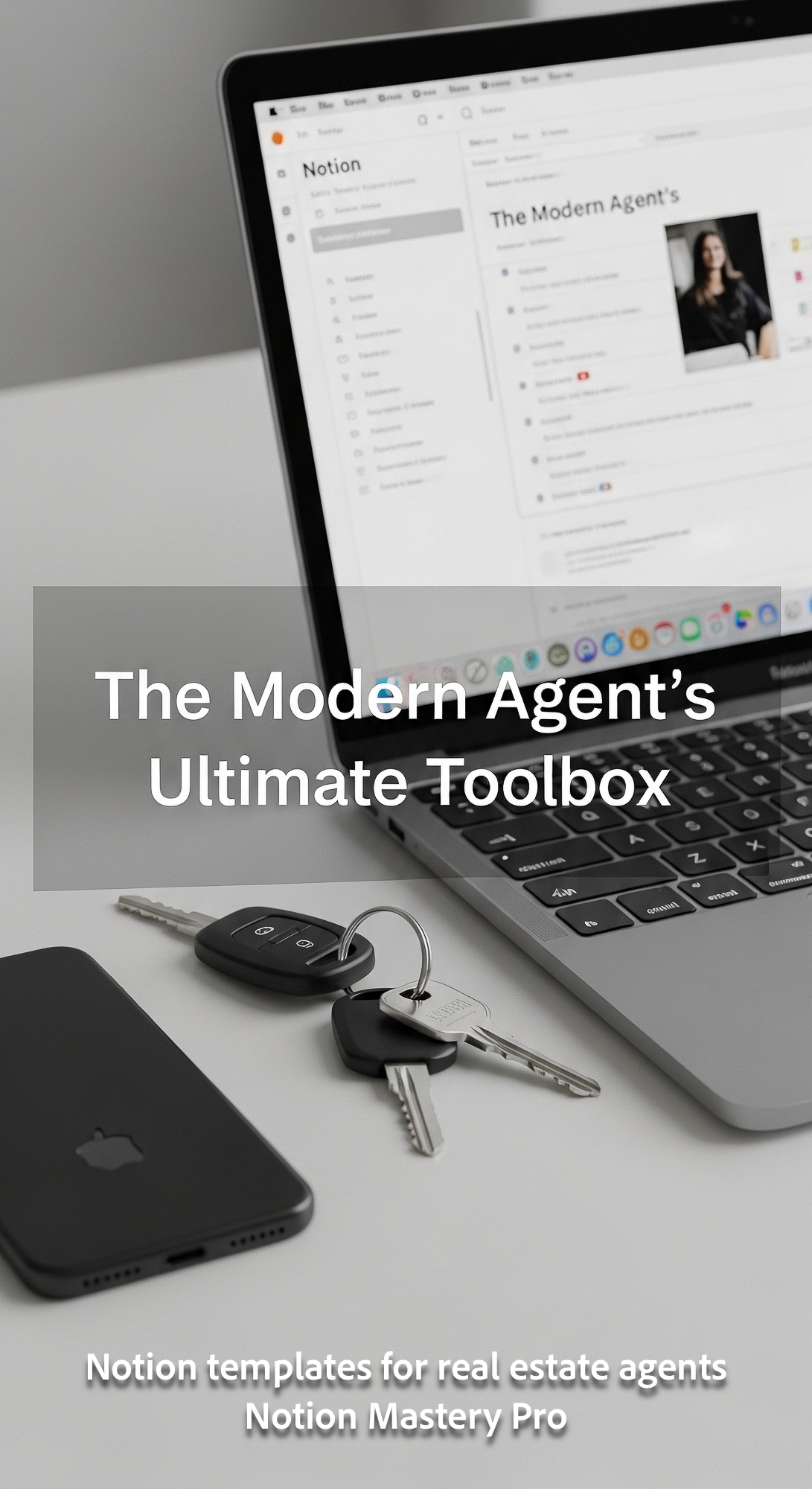 Close up of a sleek black smartphone and modern house keys on a minimalist desk next to an open MacB