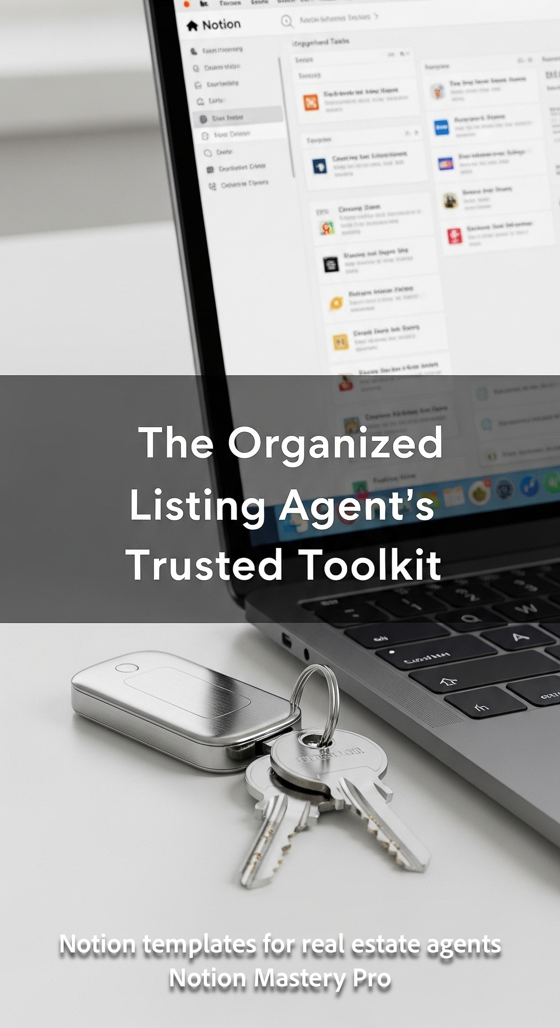 Close up of a sleek brushed metal key fob and modern house keys on a minimalist desk next to an open