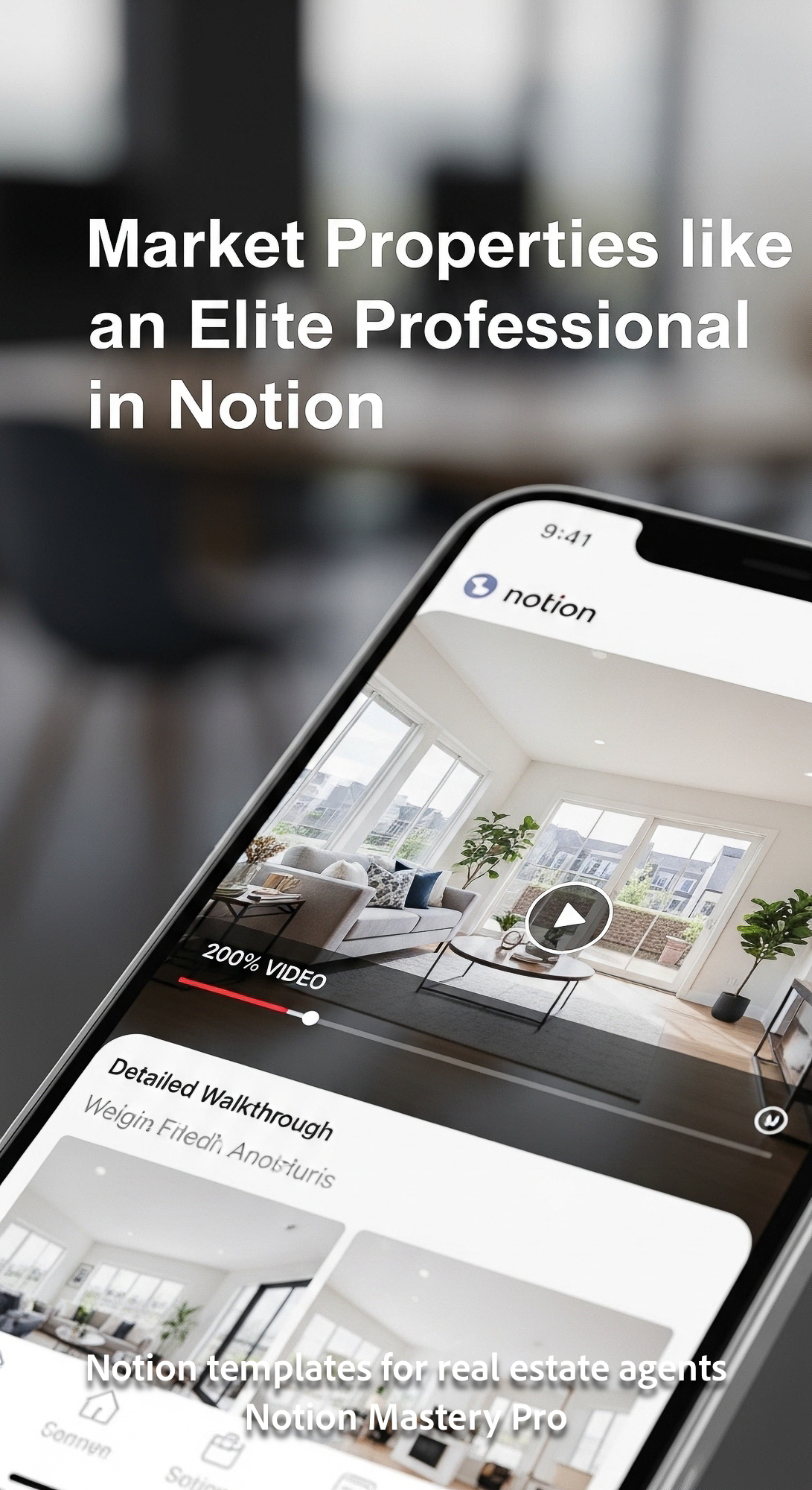 Close up of a sleek silver smartphone displaying a property walkthrough video within a Notion page o