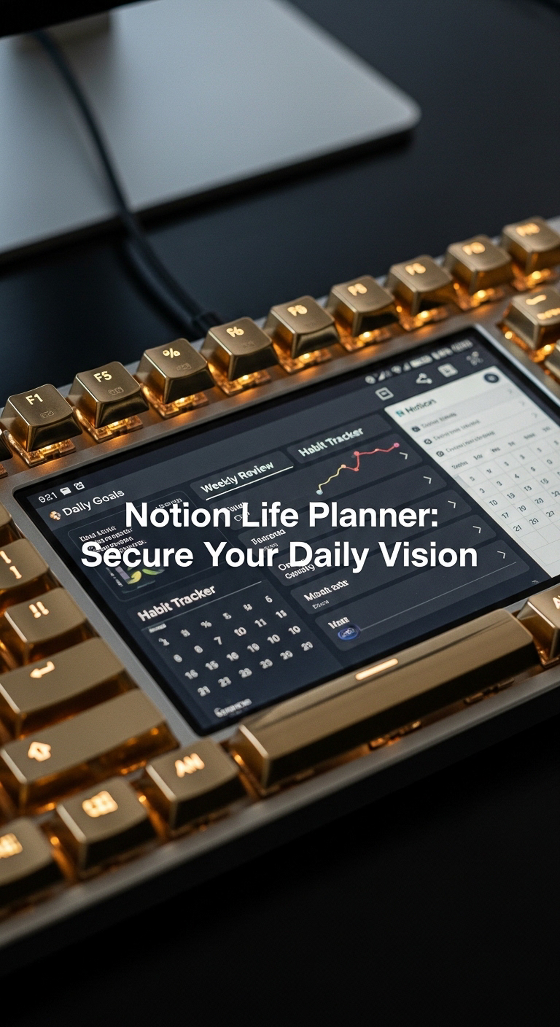 Closeup of a premium mechanical keyboard with gold keycaps a screen showing a Notion Life Planner ov