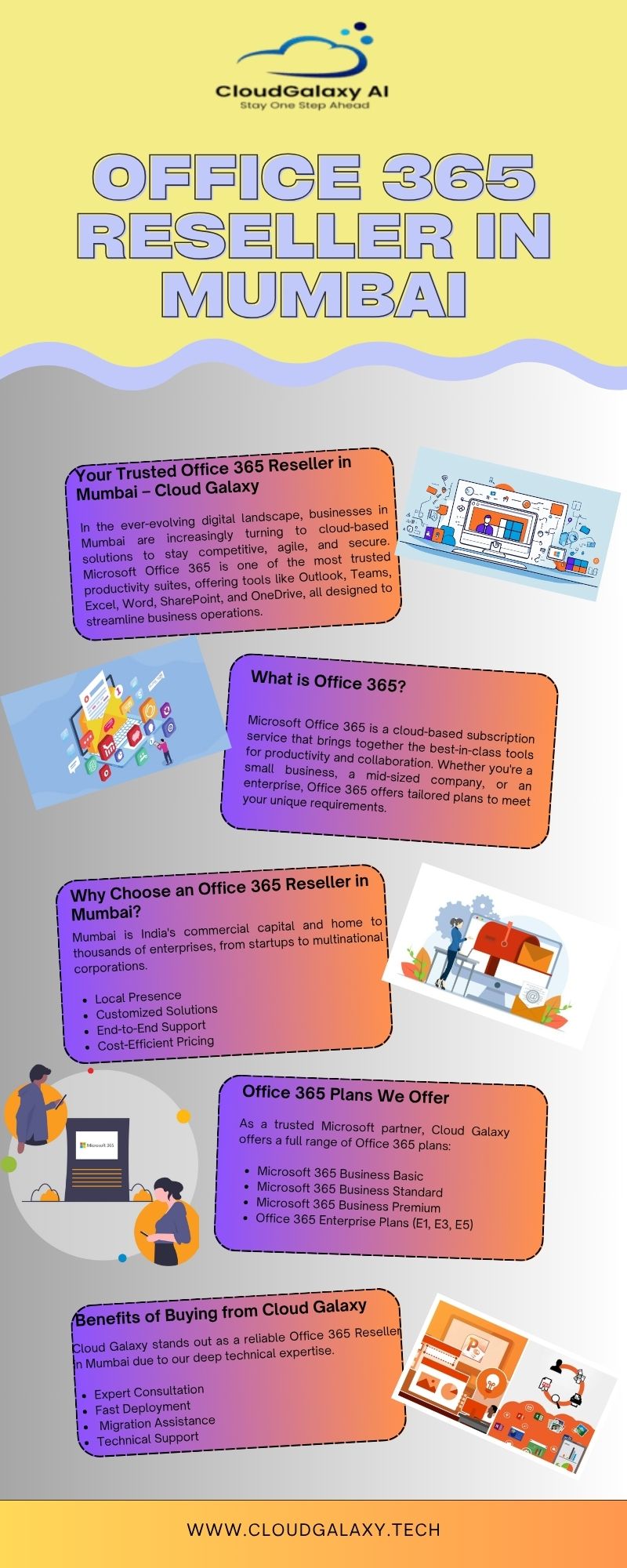 Cloud Galaxy offers comprehensive cloud solutions tailored for modern enterprises. As a trusted Office 365 Reseller in Mumbai, we provide businesses with reliable access to Microsoft 365 plans, seamless onboarding, migration, and end-to-end support. Our team ensures your organization benefits from enhanced productivity, collaboration, and data security through customized Microsoft solutions. Whether you're a startup or an established business, we help you scale with ease. Explore our Office 365 plans now and transform your business with Cloud Galaxy!