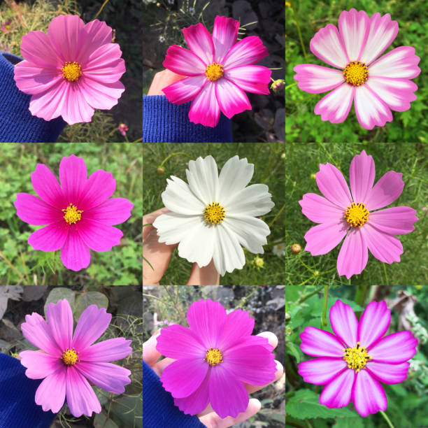 Collage of cosmos flowers in the garden.