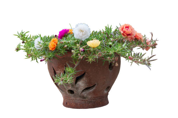 Colorful Portulaca flowers in brown pot isolated on white background included clipping path.